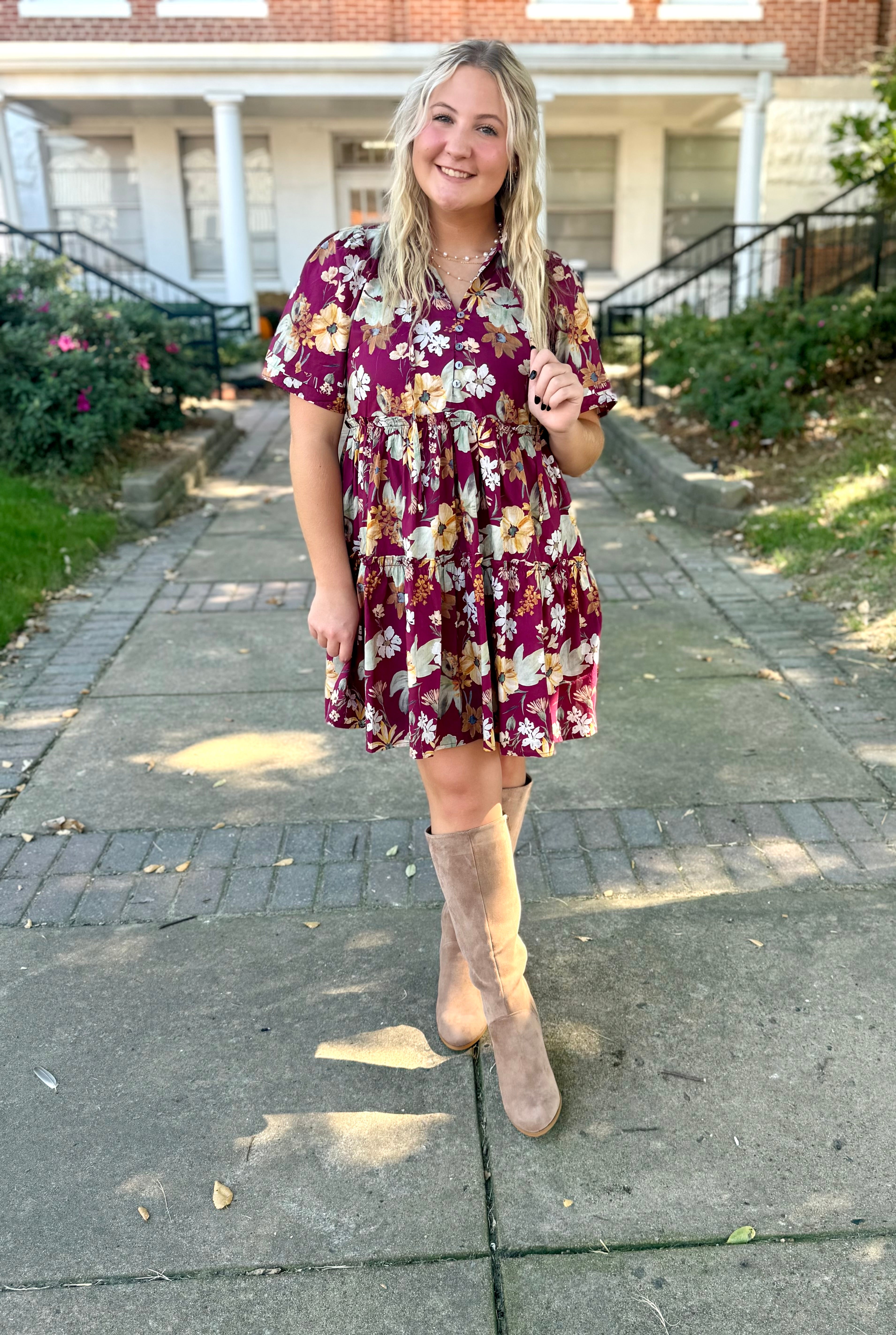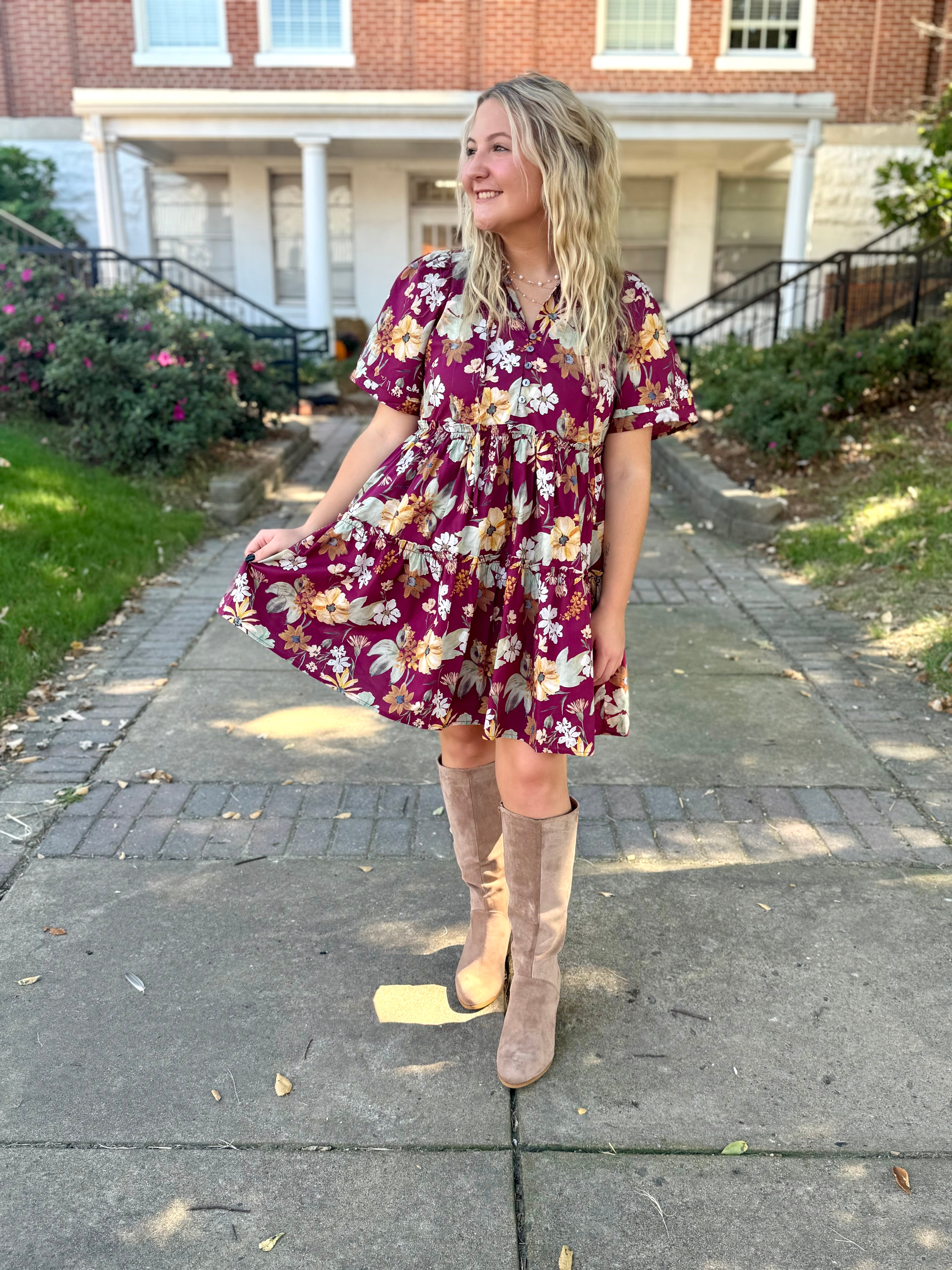 Step into fall with our Autumn Blossom Dress — the perfect mix of cozy and chic! This deep wine floral print pops with golden and cream blooms, giving it that effortless seasonal flair. The flowy tiered silhouette and short flutter sleeves make it as flattering as it is comfortable. Pair it with your favorite tall boots (like we did!) for a complete fall-ready look that’s perfect for brunch, pumpkin patches, or any day you want to feel effortlessly cute.
