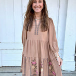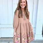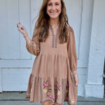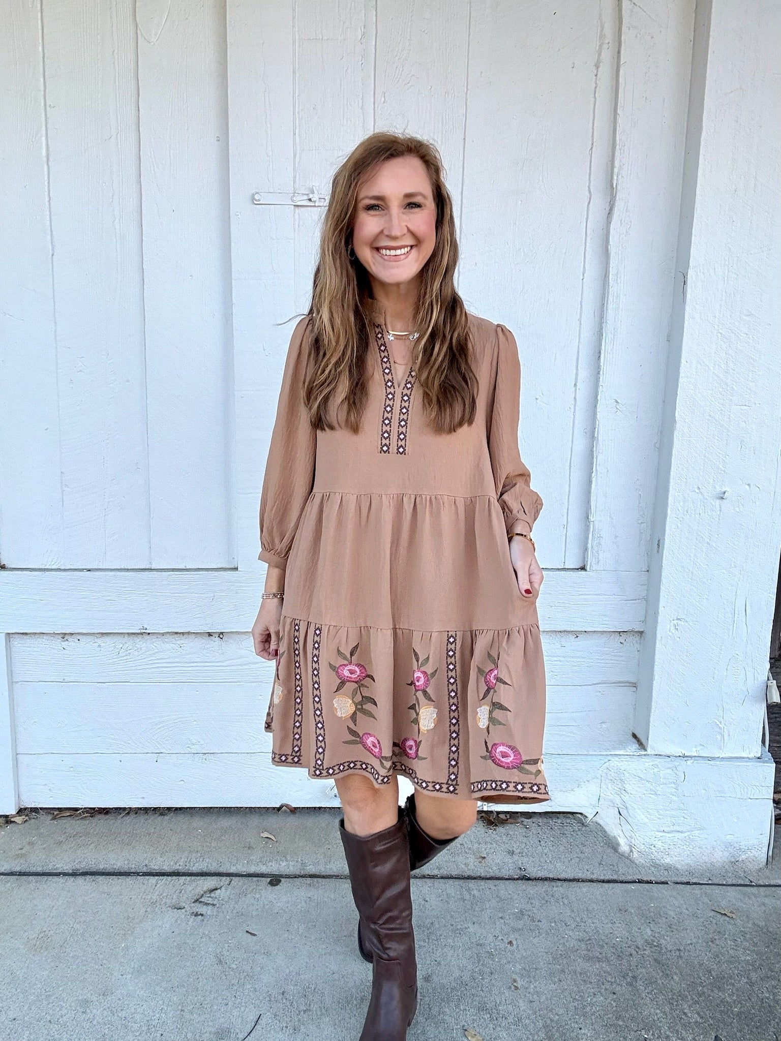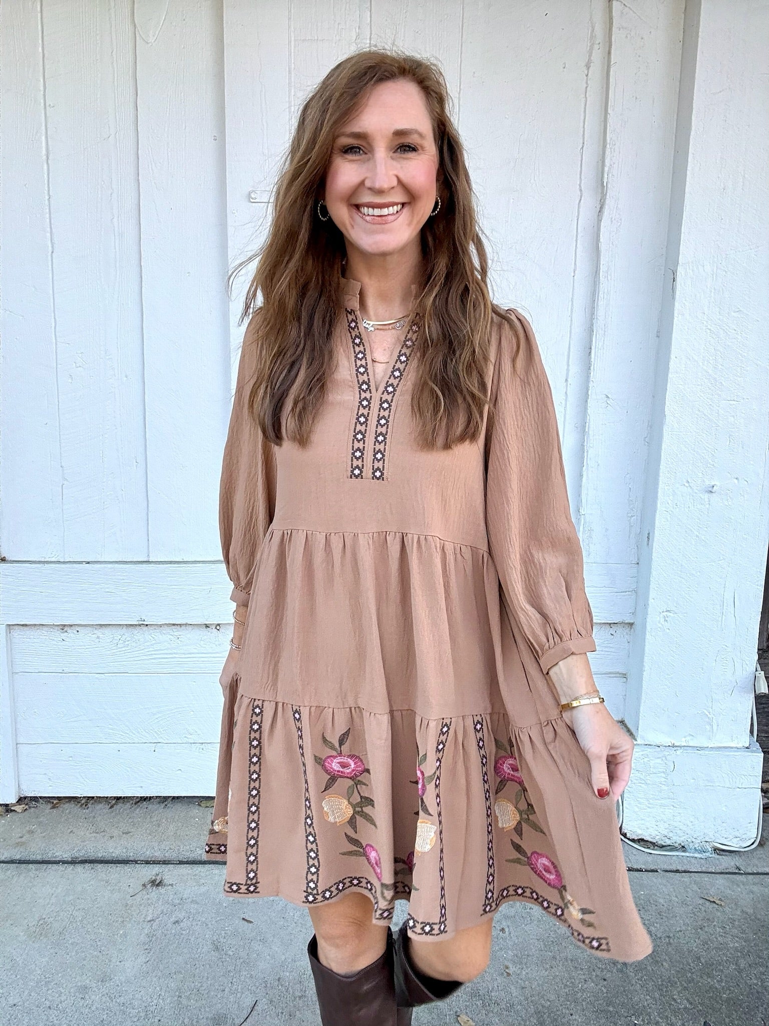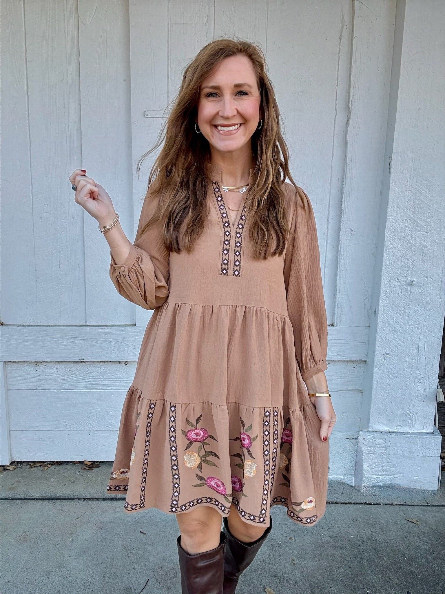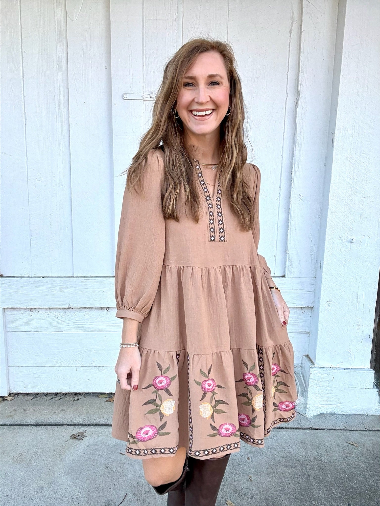 Step into effortless charm with our Blossom Breeze Embroidered Tiered Dress. This soft mocha-tan beauty features intricate floral embroidery along the hem and neckline, adding a touch of feminine artistry to an easy, everyday silhouette. The tiered body gives you a flowy, flattering shape, while the lightweight fabric keeps you comfortable from brunch dates to fall festivals. Finished with billowy sleeves and a graceful V-notch neckline, this dress pairs perfectly with boots for the season’s sweetest look.