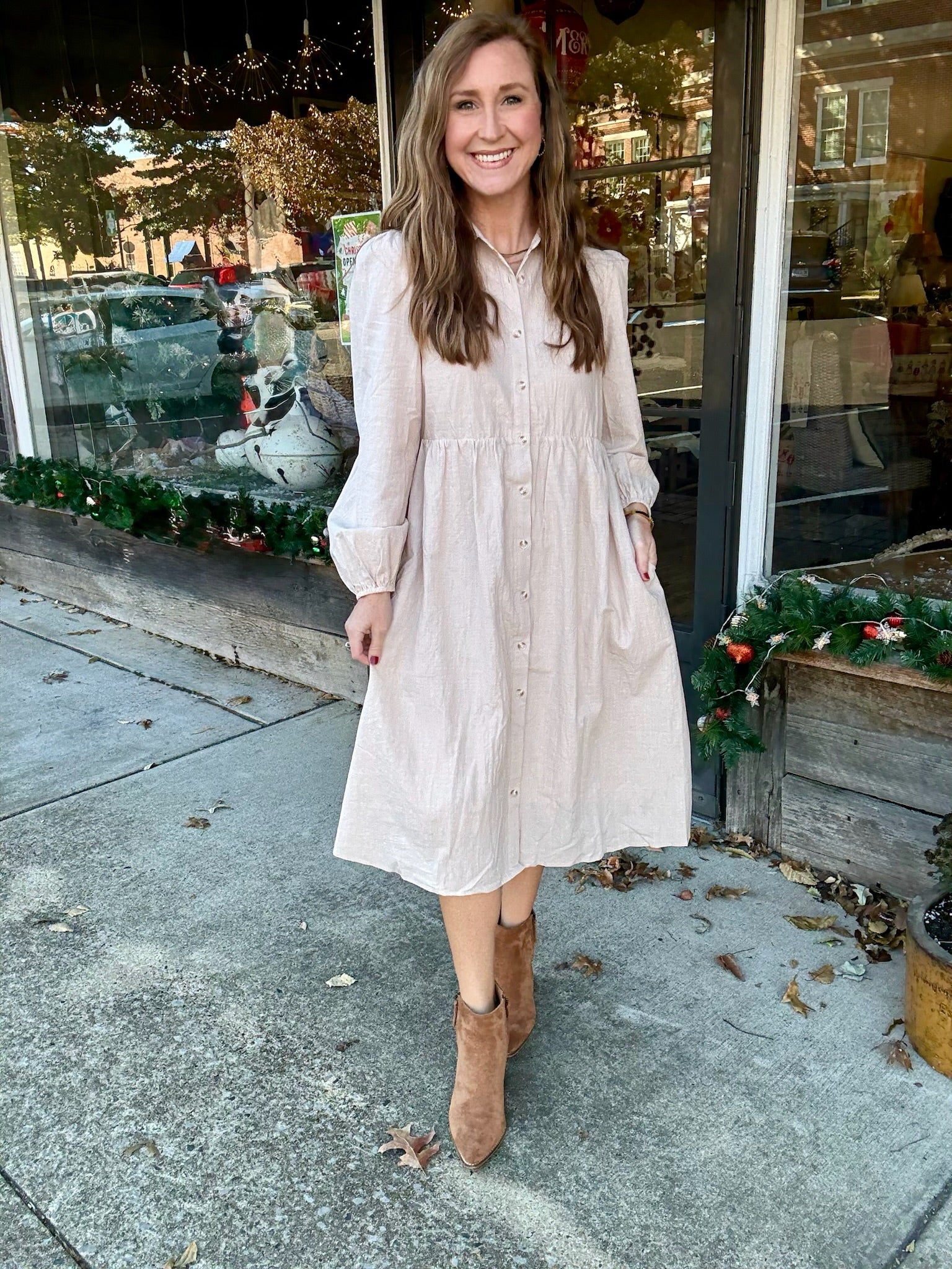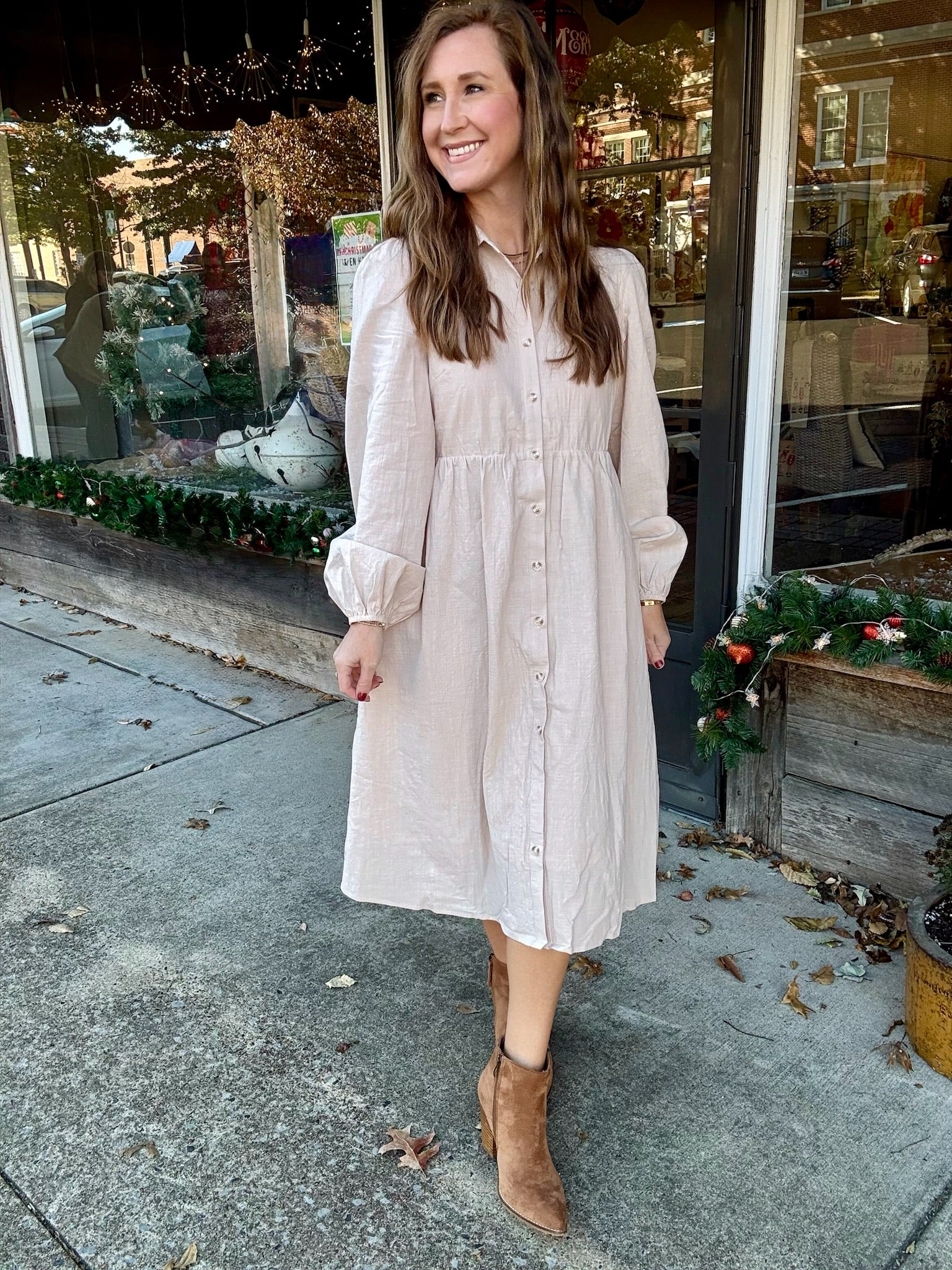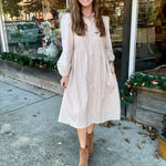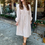Embrace effortless femininity in our Charming Grace Midi Dress. This light, neutral beauty features a subtle textured fabric that drapes softly with every step. The button-front design and gently gathered waist create a flattering, timeless silhouette, while the billowed sleeves add just the right touch of romance. Perfect for brunch, church, family photos, or everyday elegance, this midi dress is the definition of simple sophistication. Pair with booties for a cozy fall look or sandals come spring.