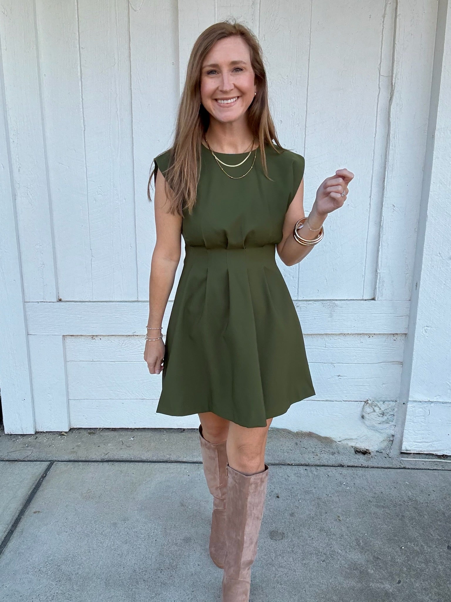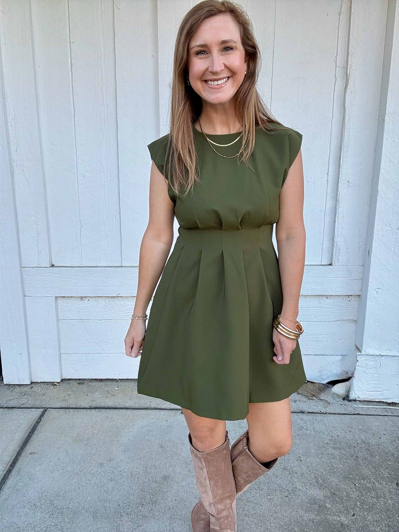 Effortlessly chic and perfect for any season — our Olive Classic Pleated Mini Dress is your new go-to for timeless style. Featuring structured pleats and cap sleeves for a flattering fit, this dress pairs beautifully with tall boots for fall or sandals in warmer weather. Whether you’re heading to brunch, a date night, or a casual event, this piece is a must-have closet staple.