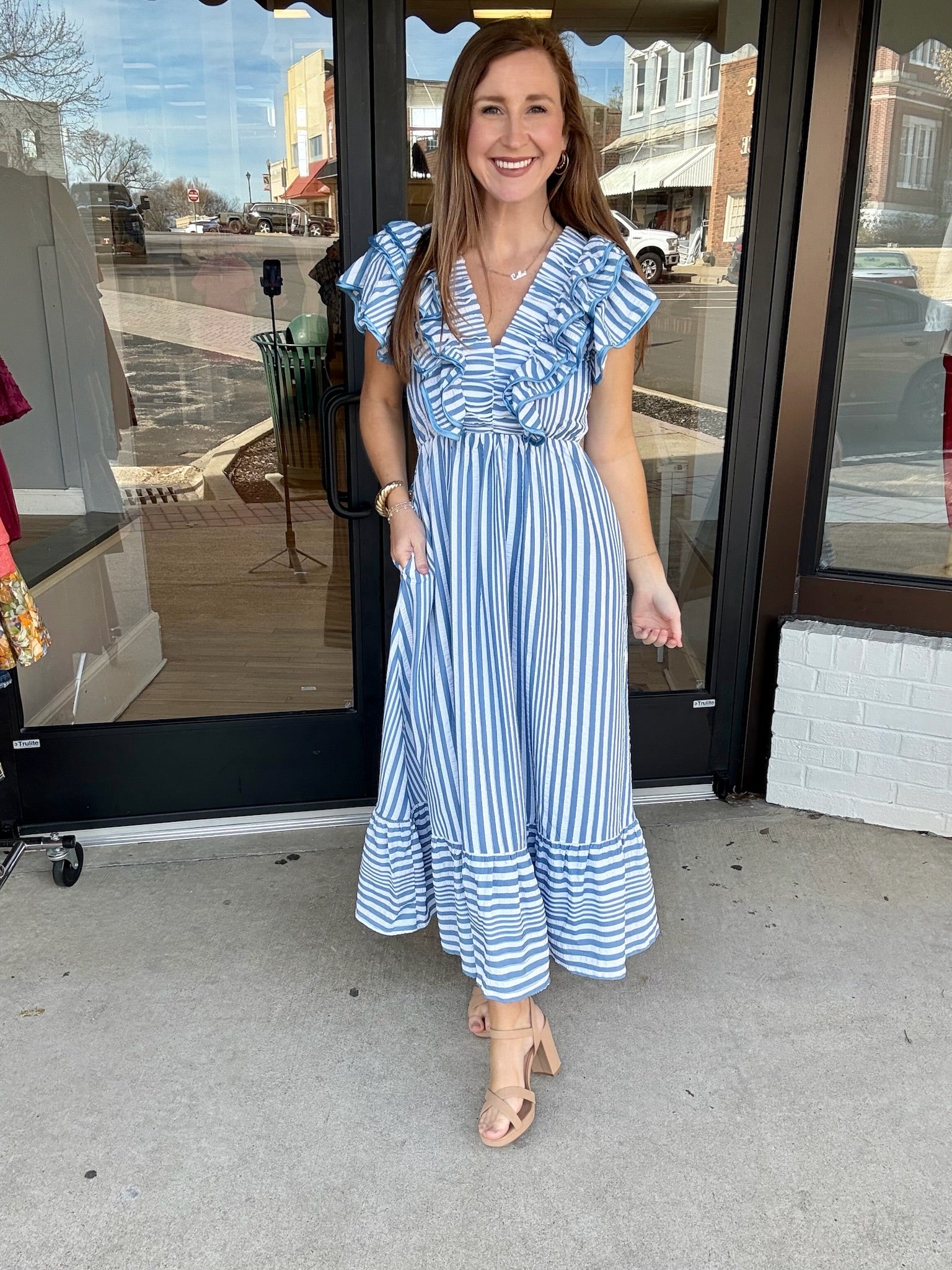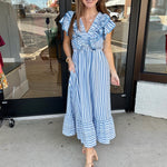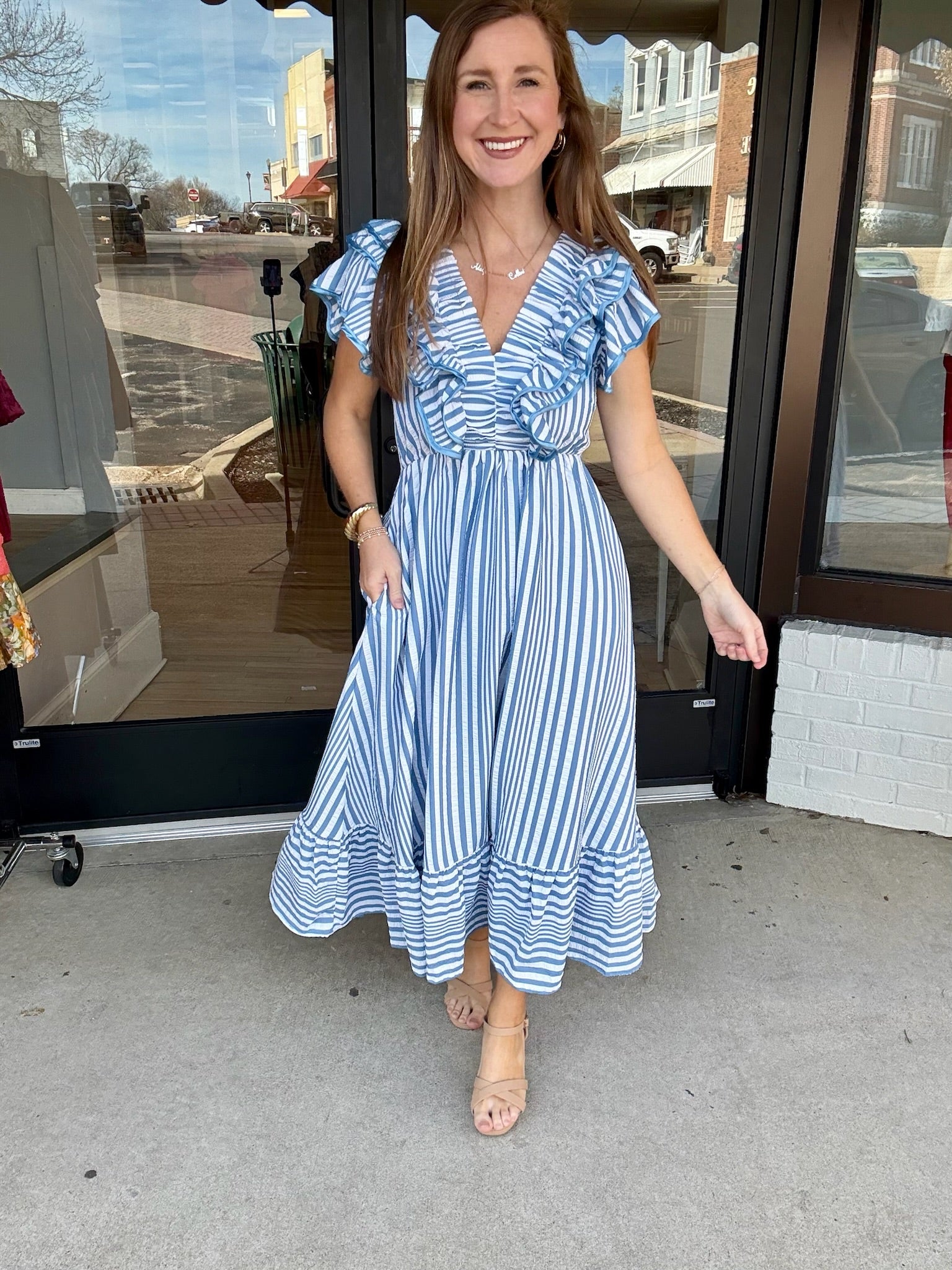 Easy, breezy, and effortlessly pretty! This blue striped midi dress features soft ruffle details, a flattering flowy fit, and the perfect lightweight feel for sunny days. Dress it up with wedges or keep it casual with sandals — your new go-anywhere favorite! ☀️