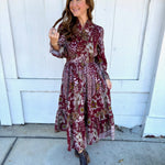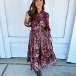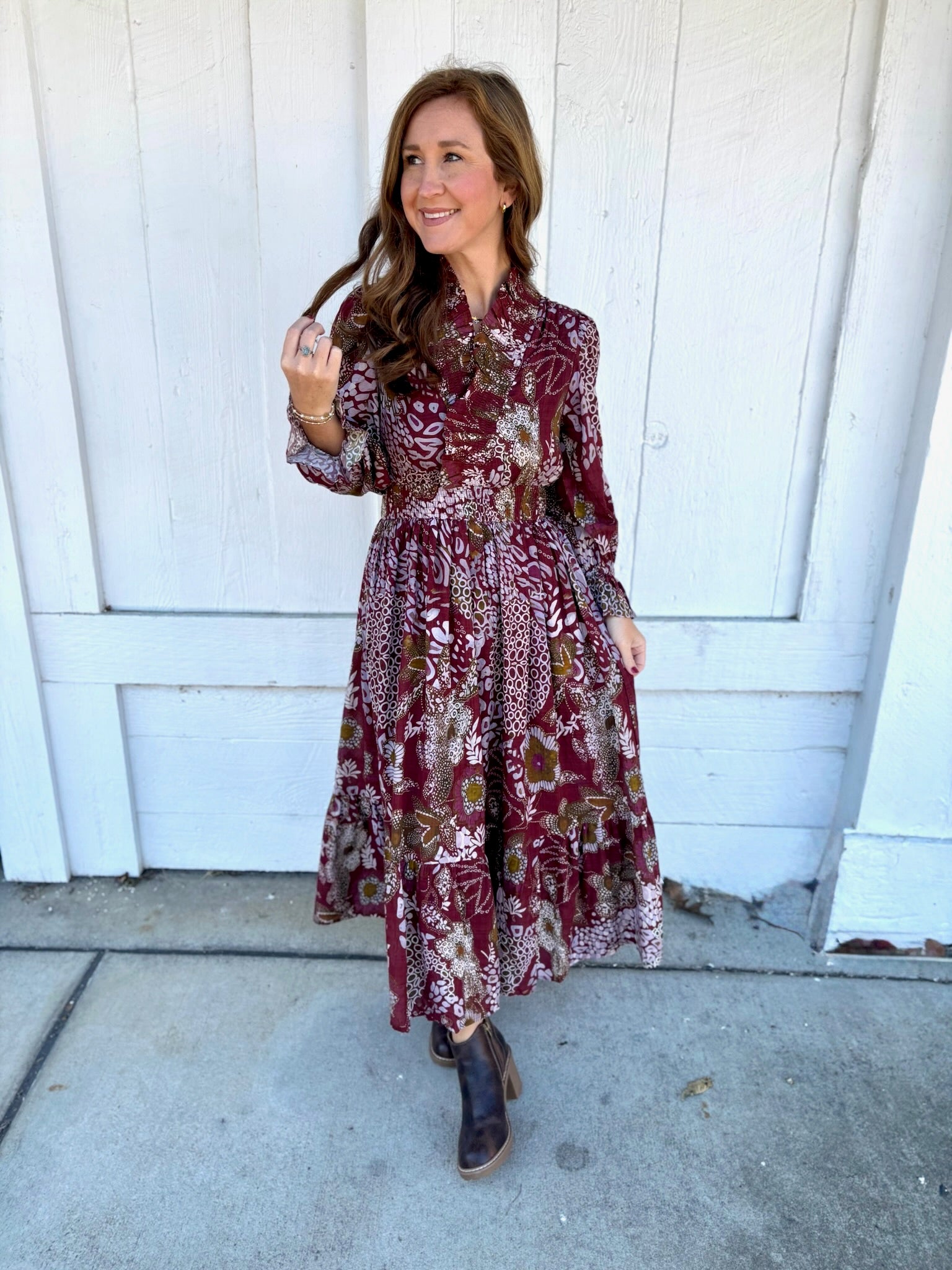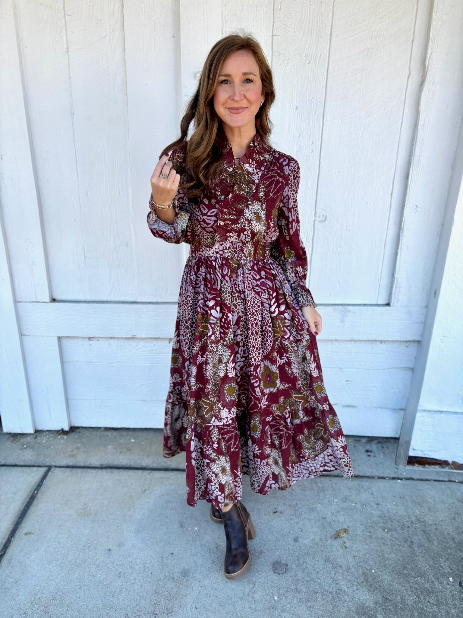 Flowy, feminine, and full of fall charm — this boho-inspired midi dress features a rich burgundy base with a mixed patchwork floral print in warm earthy tones. Designed with a flattering smocked waist, button front bodice, and tiered skirt for effortless movement. Perfect for family photos, fall events, or Sunday brunch paired with booties. Soft lightweight fabric makes it both comfortable and elevated for all-day wear. Size fits true with an easy, relaxed silhouette.