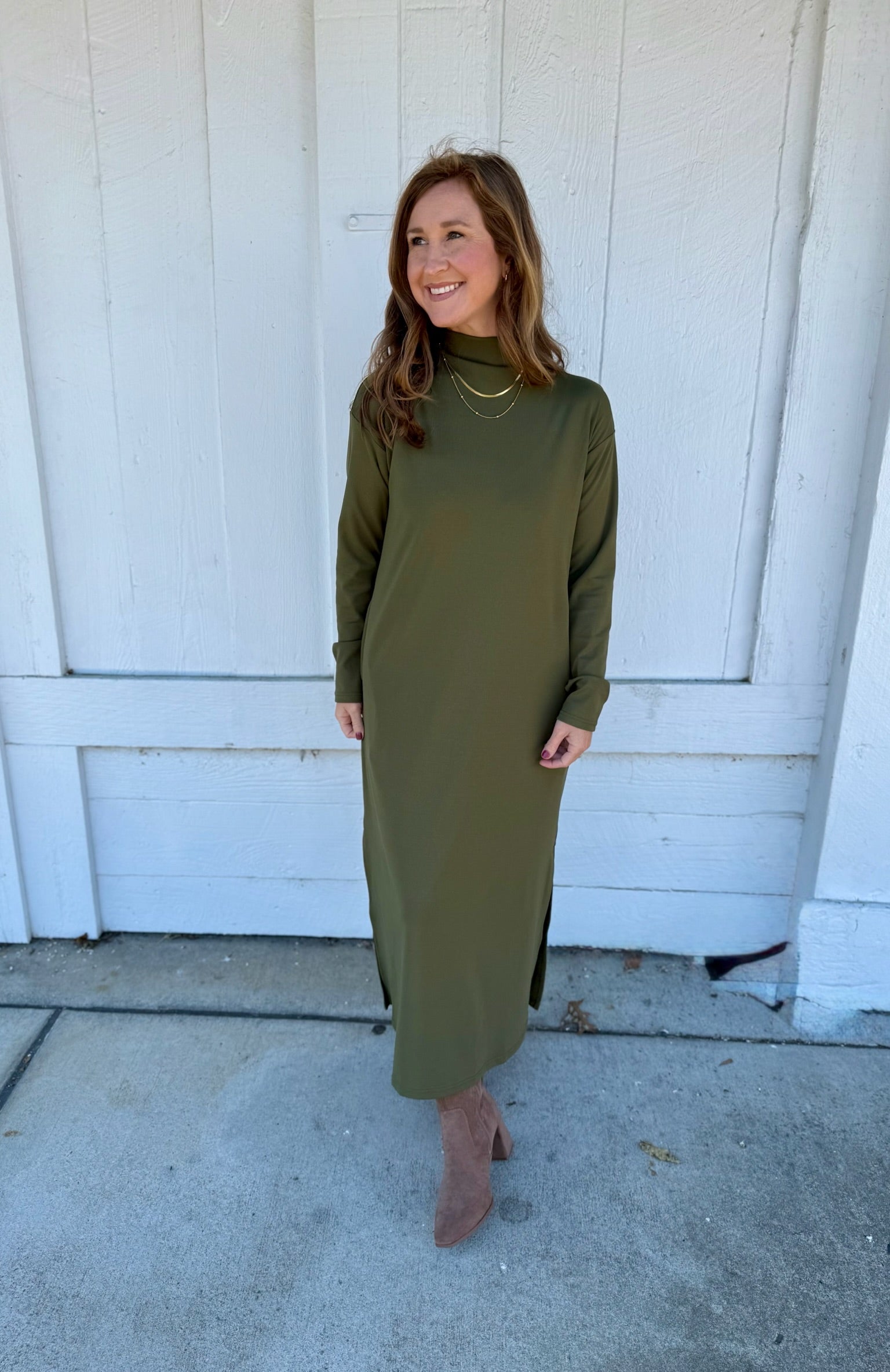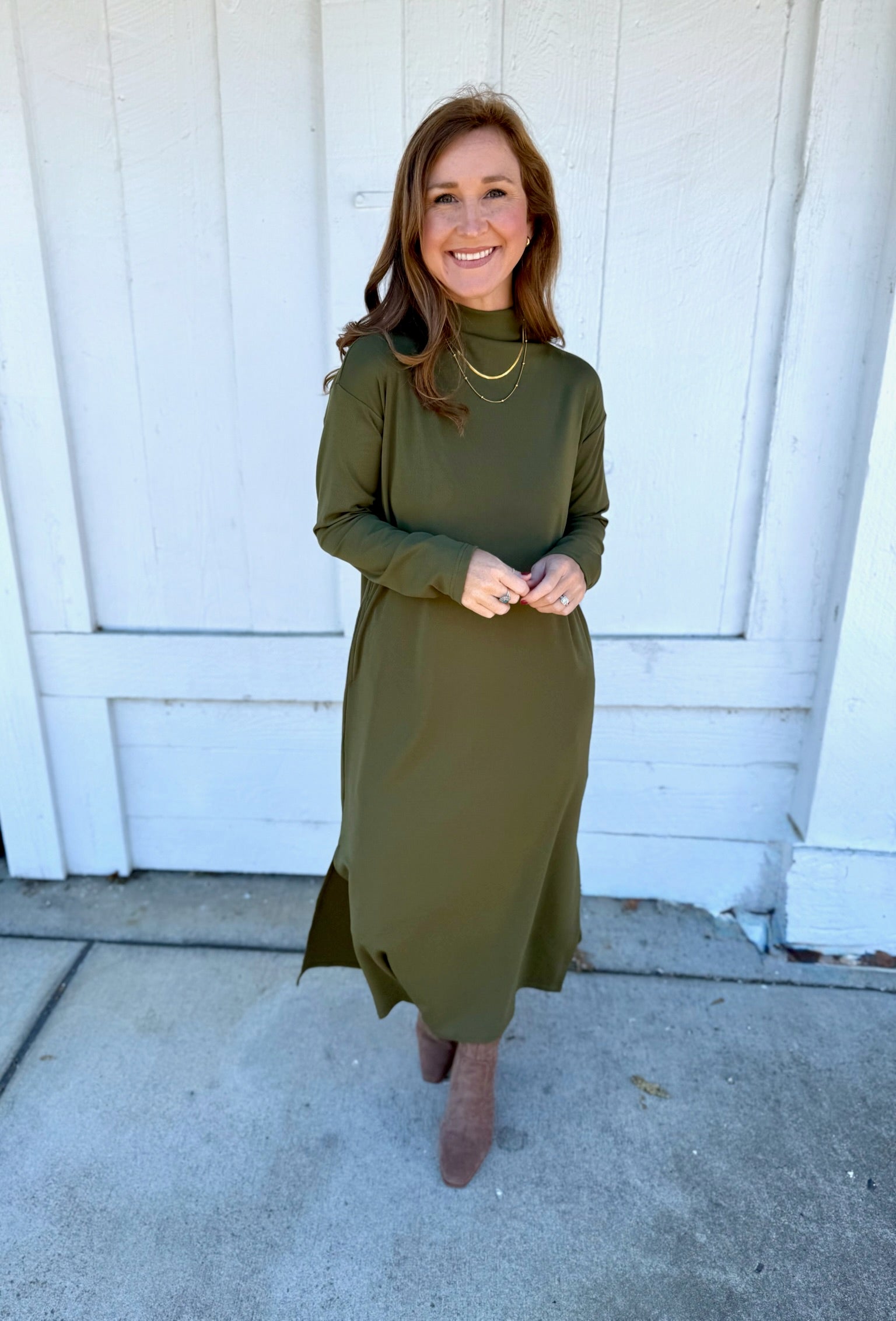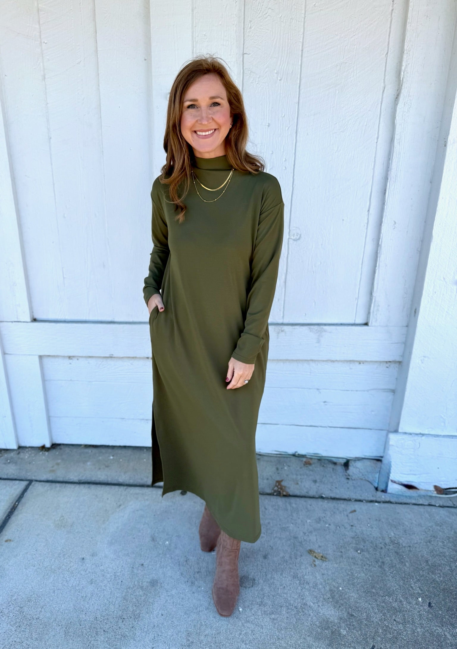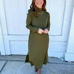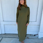 Simple, sleek, and effortlessly elevated — this olive long-sleeve dress features a modern mock neckline and relaxed silhouette with side slits for easy movement. Made from a soft, comfortable knit you’ll want to live in, it’s the perfect blend of casual and polished. Dress it up with booties and gold jewelry for dinner or wear it with sneakers for a comfy day out. Includes pockets for extra practicality. True to size with a relaxed, flattering drape.