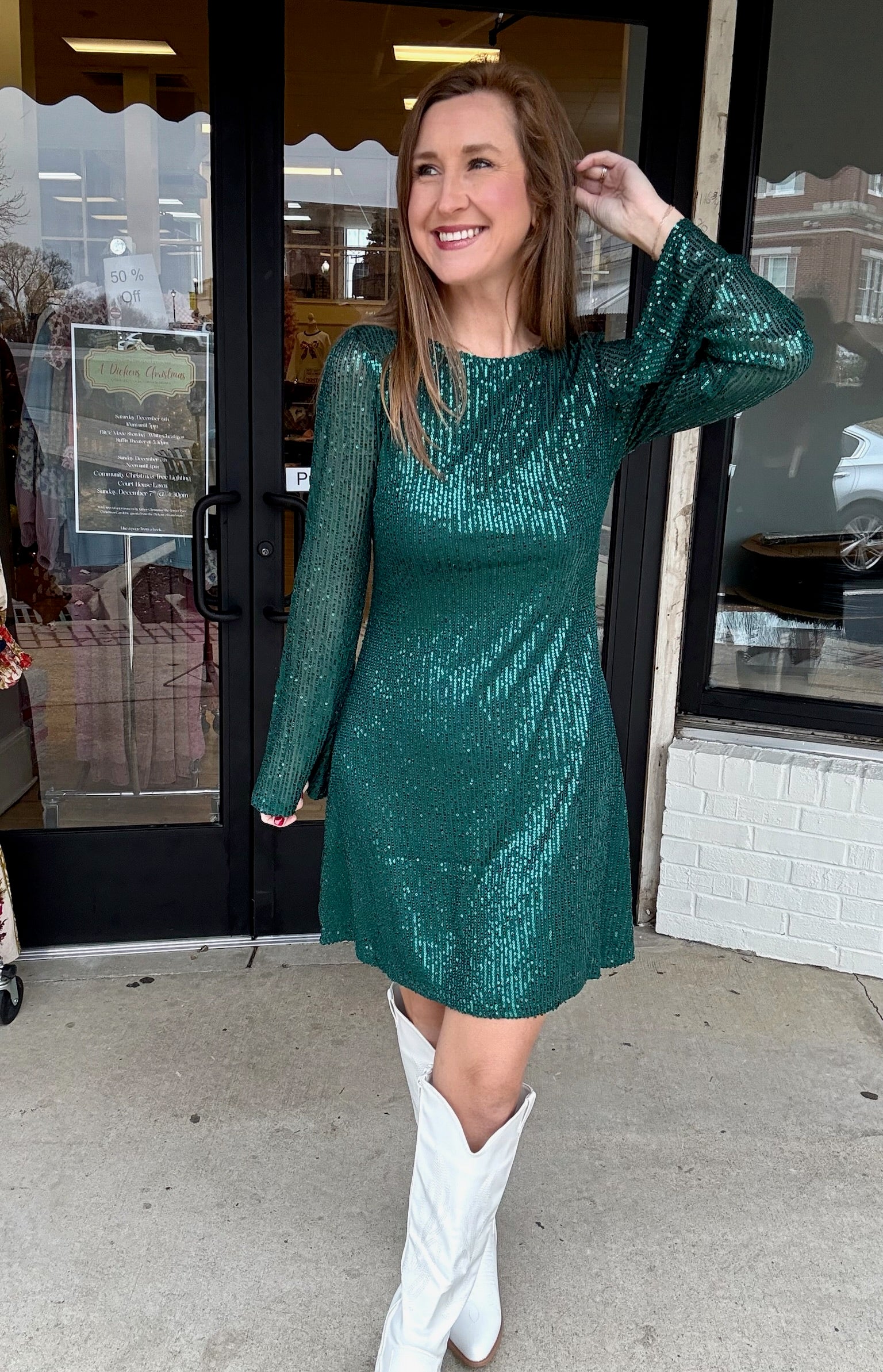 Shine bright at every holiday party in this show-stopping emerald sequin dress! Fully covered in shimmering green sequins, this dress catches the light from every angle while the relaxed A-line silhouette keeps it comfortable and flattering. The long, flowy sleeves add the perfect touch of elegance, making it a festive favorite for Christmas parties, New Year’s Eve, events, or any night you want to sparkle.