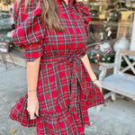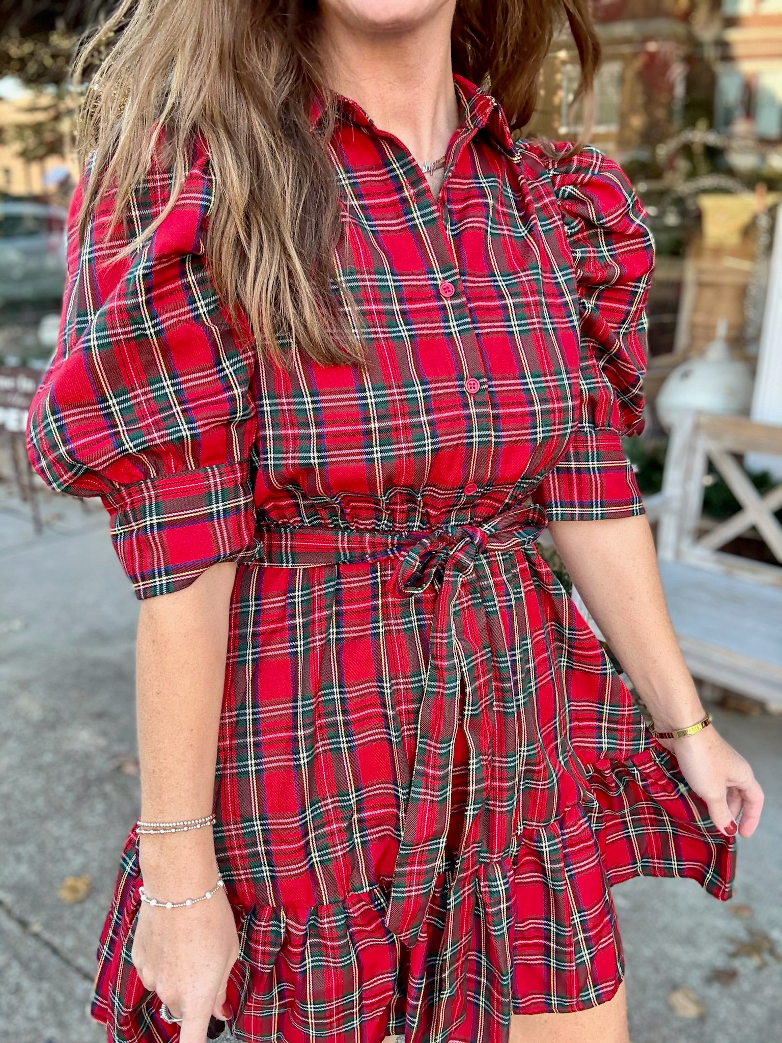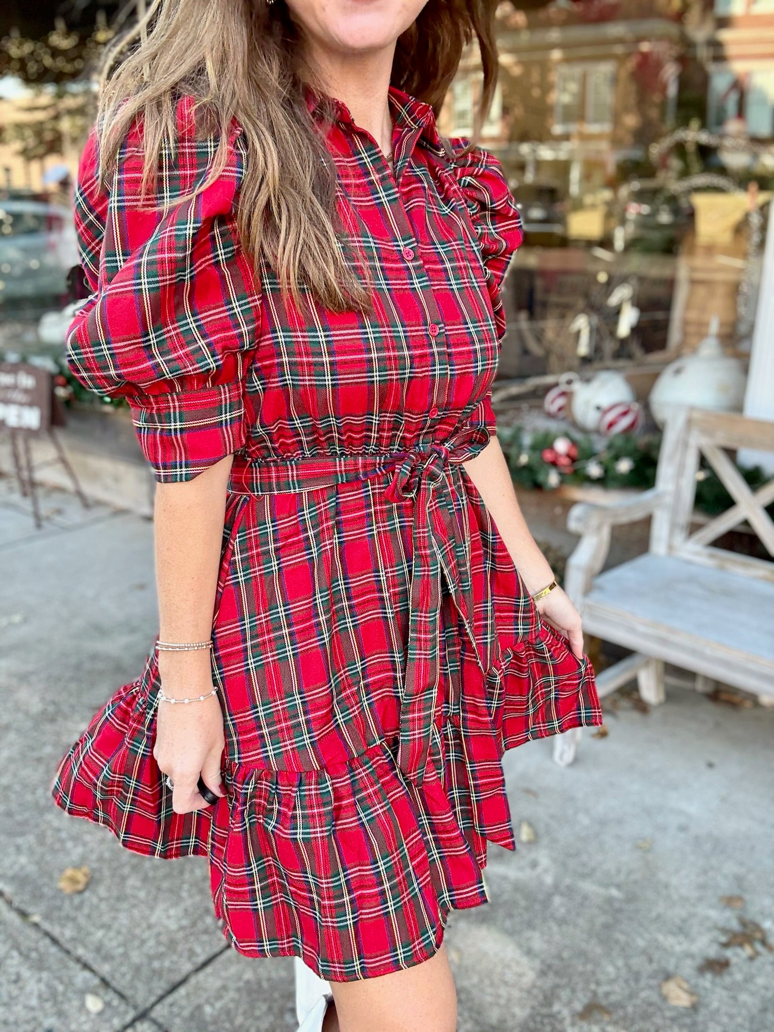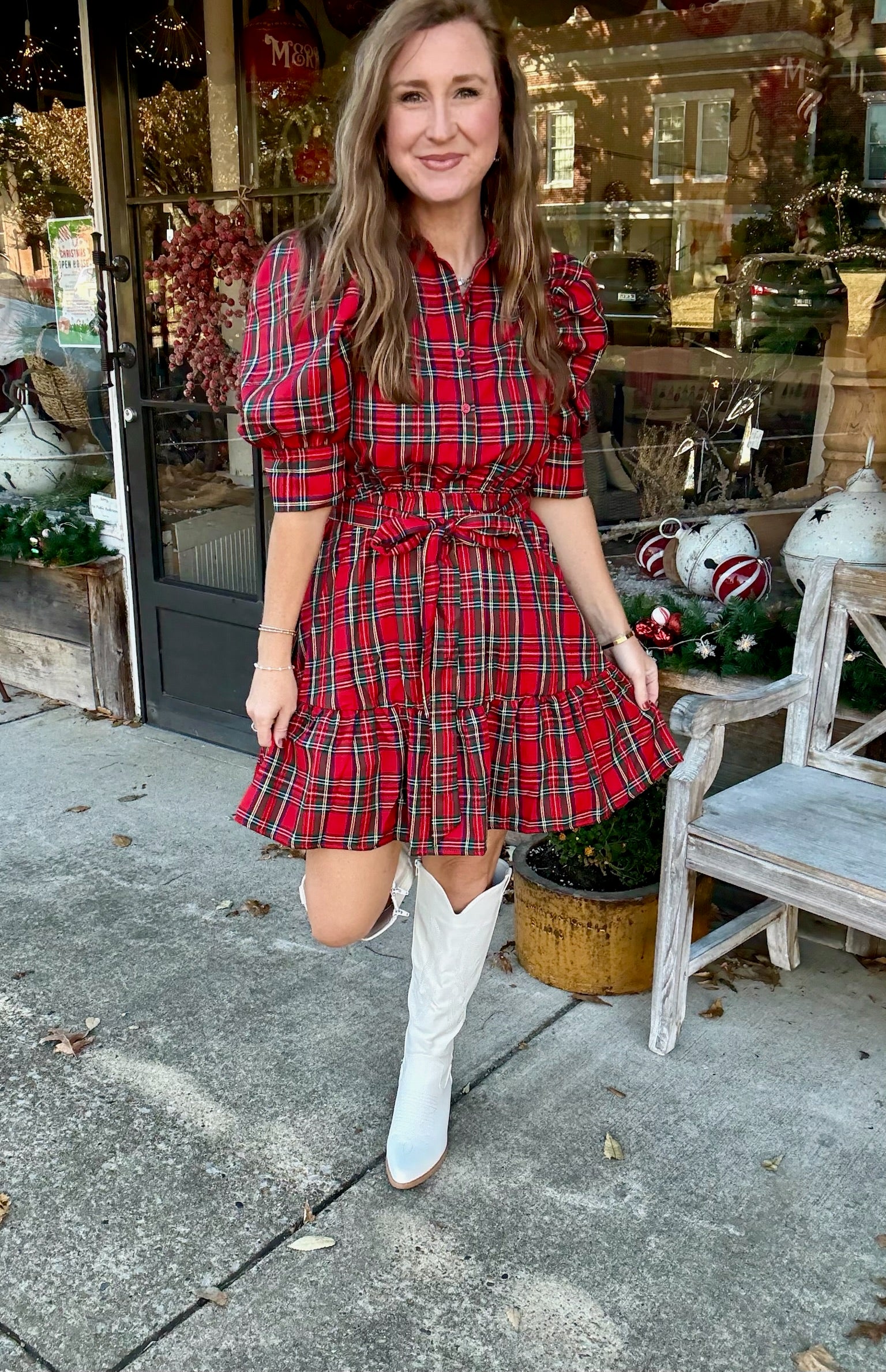 Make holiday memories in the most darling way with our Merry Moments Plaid Dress! This classic red-and-green tartan print brings all the festive charm, while the tiered skirt and flattering waist tie create the sweetest feminine shape. Puff sleeves add a playful touch, and the button-front detail keeps it timeless and polished. Whether you’re headed to Christmas photos, holiday parties, or strolling downtown with a peppermint mocha, this dress guarantees compliments. Pair it with boots for the cutest seasonal look!