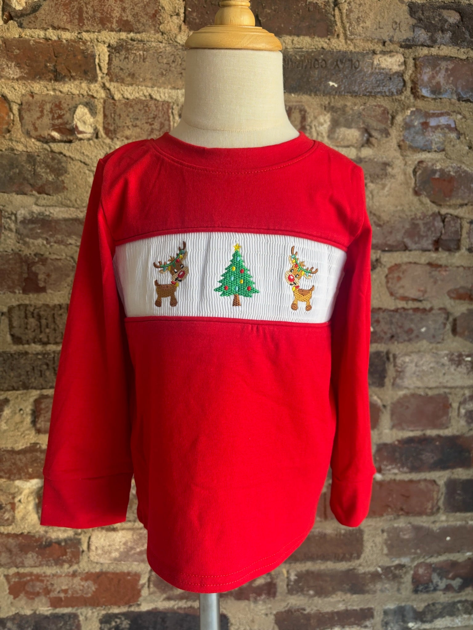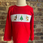 The perfect festive top for your little one! This bright red long-sleeve shirt features an adorable smocked panel with twinkling Christmas tree and reindeer embroidery — full of charm and holiday cheer. Soft, comfy, and easy to pair with jeans or corduroys for Christmas photos, parties, church, or cookie baking days. A timeless Christmas favorite they’ll love all season long. 🎄✨