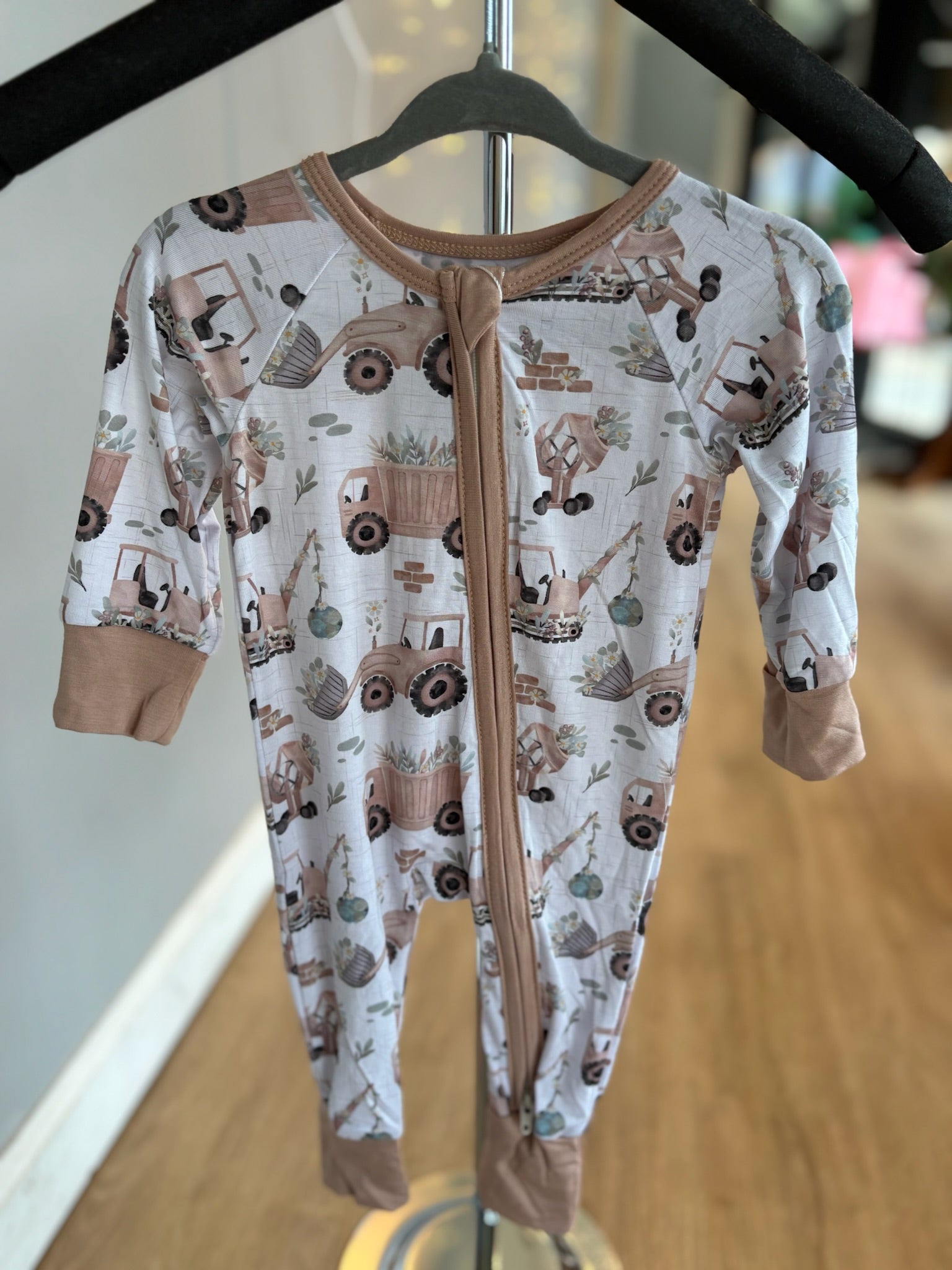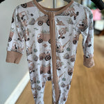 Tuck your little one into farmyard coziness with our Little Farmer Zipper Footie! Covered in neutral colored tractors with greenery, this print is full of countryside charm. Made from breathable bamboo waffle fabric, the footie is soft against delicate skin with just the right amount of stretch for wiggles, crawls, and sweet dreams. A two-way zipper makes changes quick and easy, while fold-over mitts on smaller sizes keep tiny hands warm and protected. Perfect for everyday wear, photo moments, and snuggles at home, this footie is a fall favorite parents will love!
