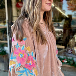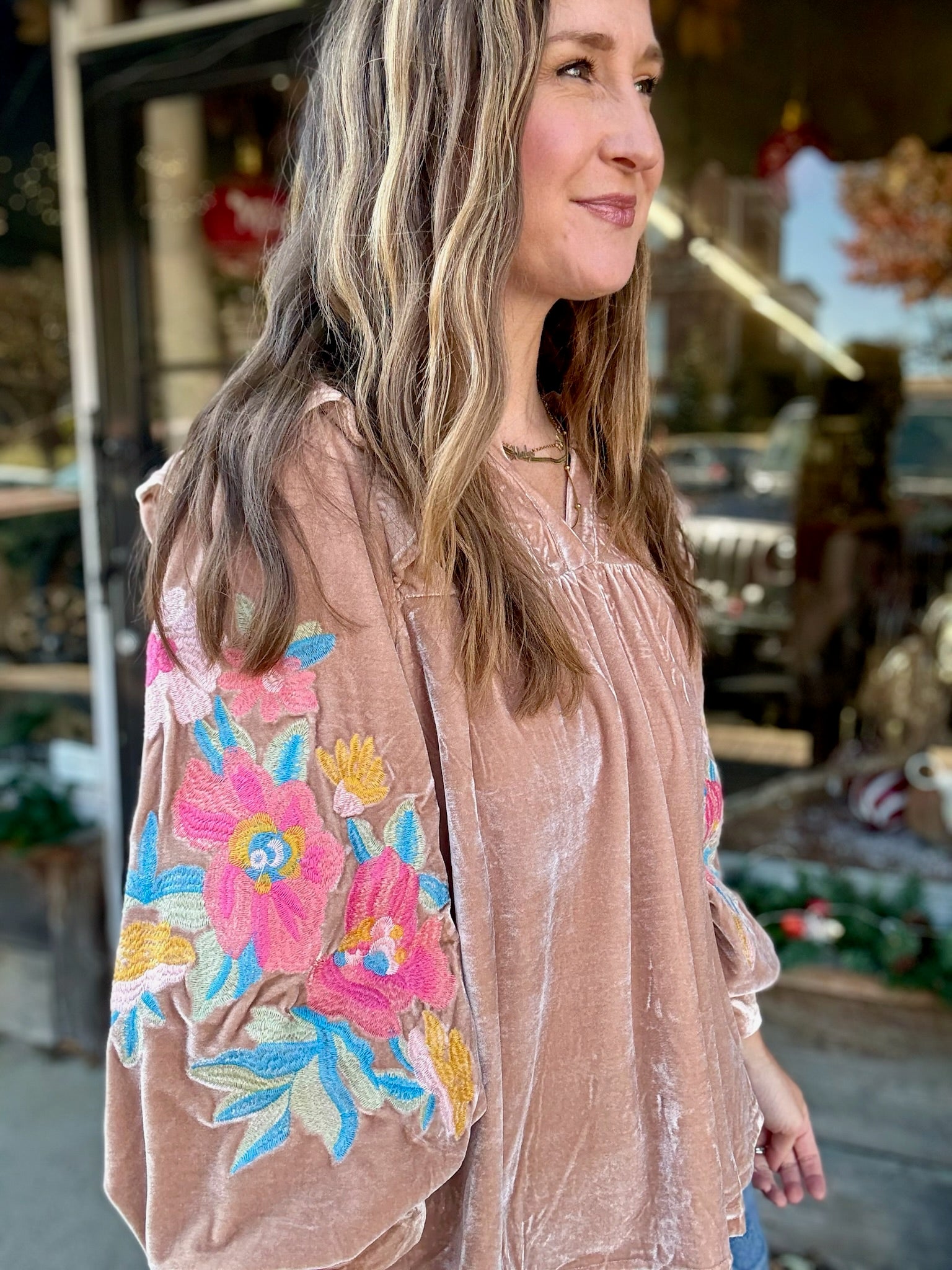 Soft, luxe, and beautifully detailed — this blush velvet blouse brings all the boho romance. The standout feature is the vibrant floral embroidery along the sleeves, adding the perfect pop of color against the plush velvet sheen. The relaxed fit and gathered neckline make it effortlessly flattering and easy to style.