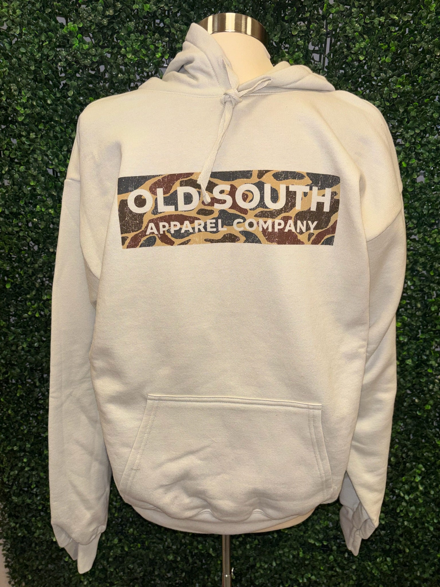 Stay cozy while repping a bold Southern style with our Old South Camo Logo Hoodie. This soft, neutral-toned hoodie features a classic pullover fit with a statement camo logo across the chest for the perfect mix of laid-back and trendy. Designed with a roomy hood, adjustable drawstrings, and a front kangaroo pocket, it’s made for all-day comfort whether you’re running errands, lounging at home, or heading out for a casual day. Pair it with leggings, denim, or joggers for an effortlessly cool look.