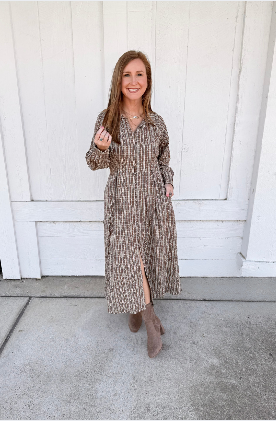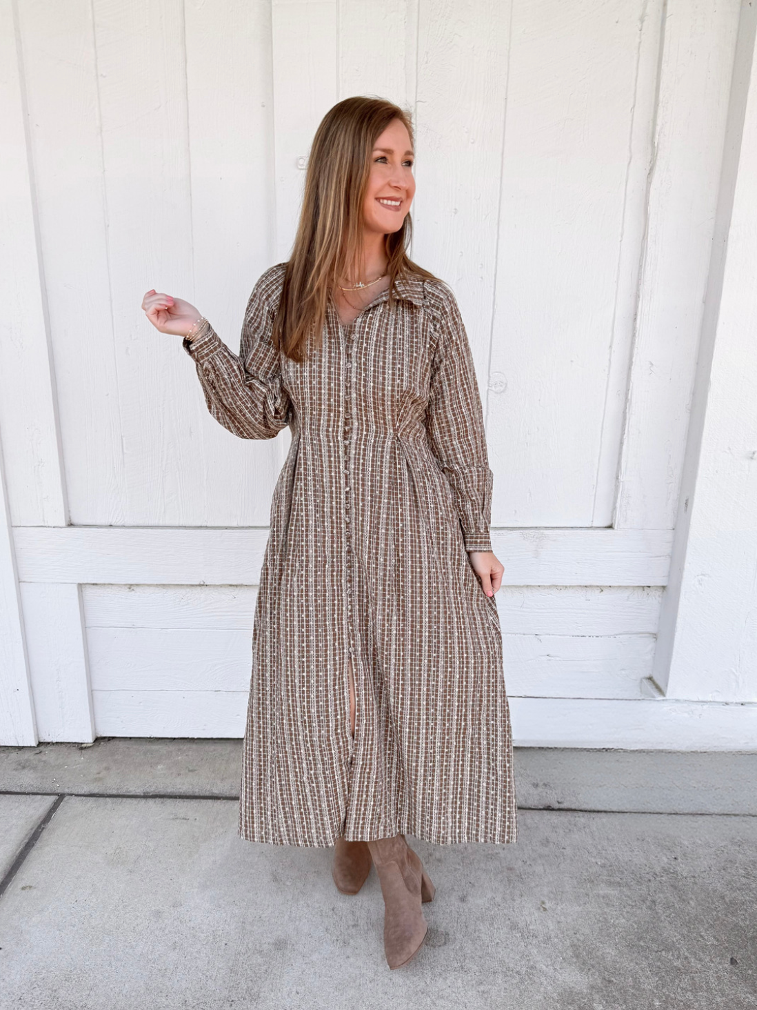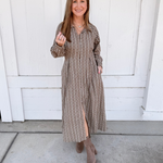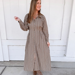 The Prairie Pilgrim Midi is your vintage-inspired dream dress! It features a button-down front and a charming collar, complemented by long sleeves for a cozy feel. Its neutral color makes it a versatile staple that’s ready to brighten up your everyday adventures with a touch of classic flair!