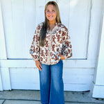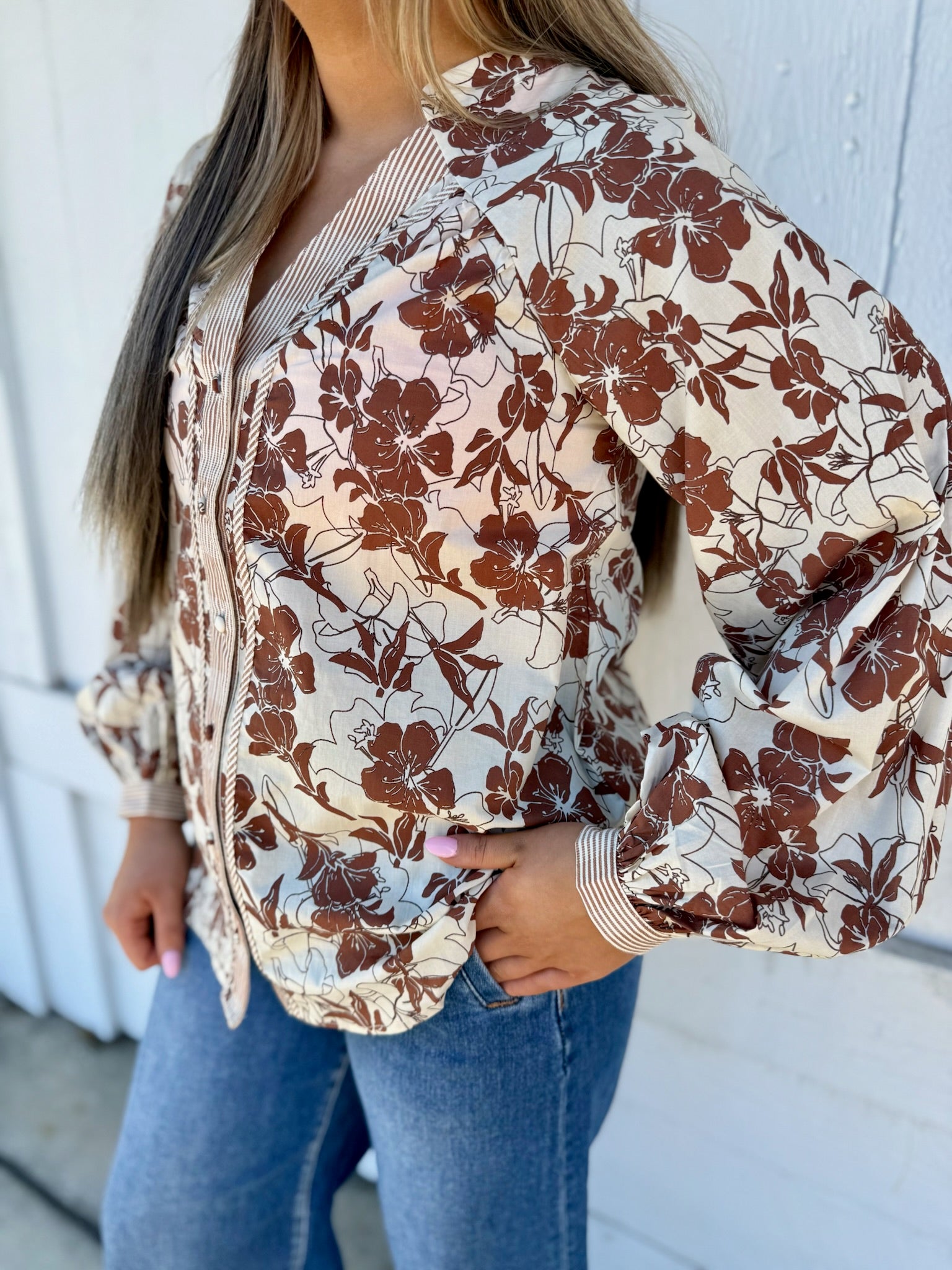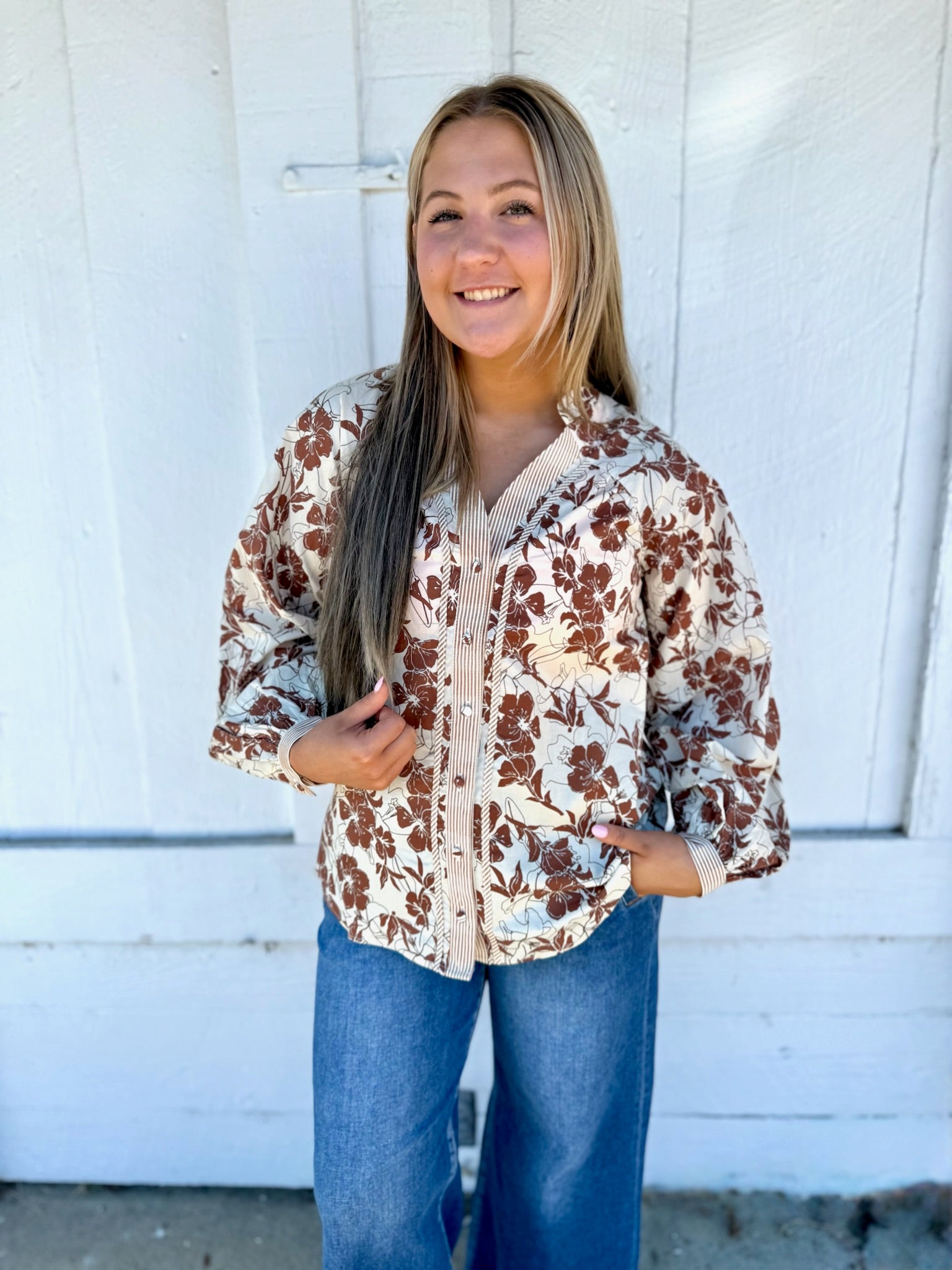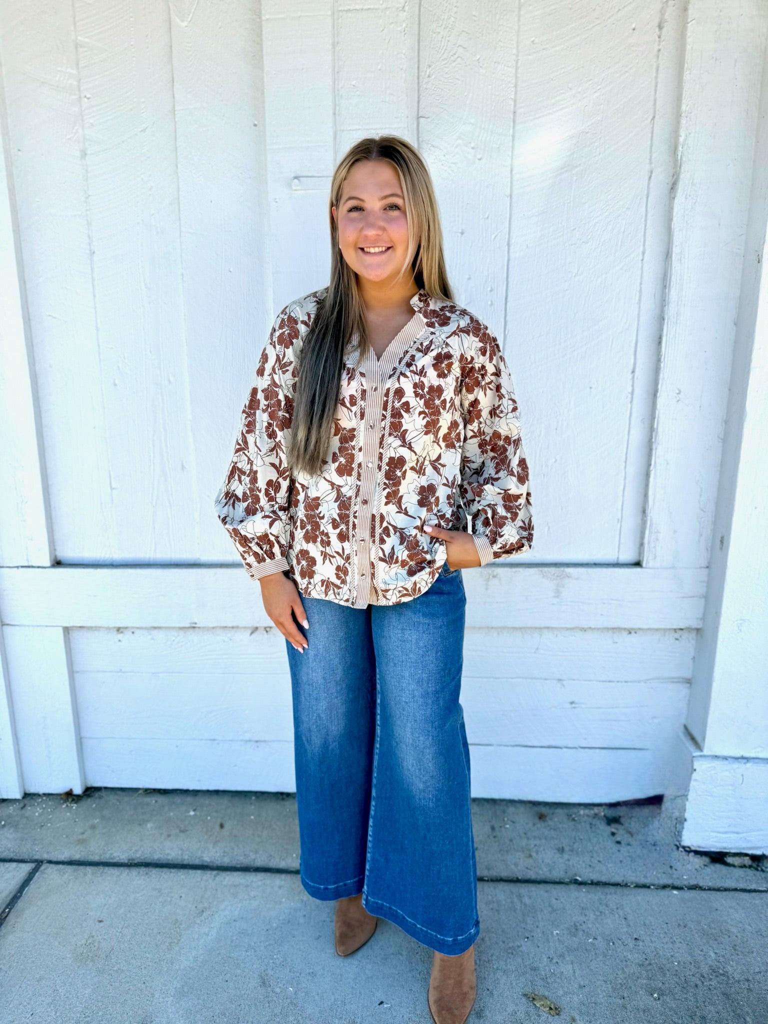 Feminine, effortless, and full of charm — The Meadow Mist Blouse brings a timeless touch to any outfit. Featuring a relaxed fit, button-front detail, and a vintage-inspired floral print trimmed with subtle stripes, this top pairs beautifully with denim or trousers for an easy, polished look. Perfect for brunch days, market strolls, or layering through the seasons.