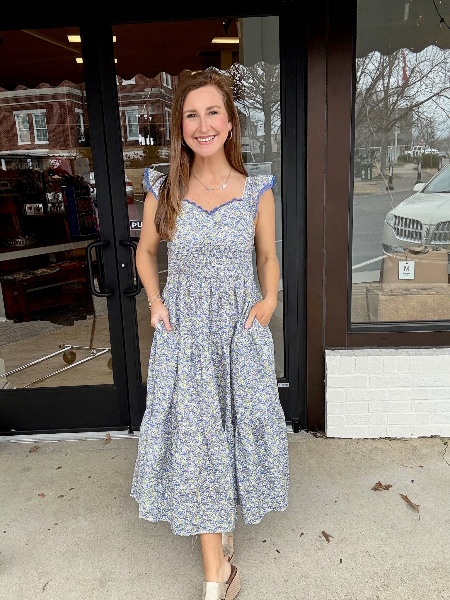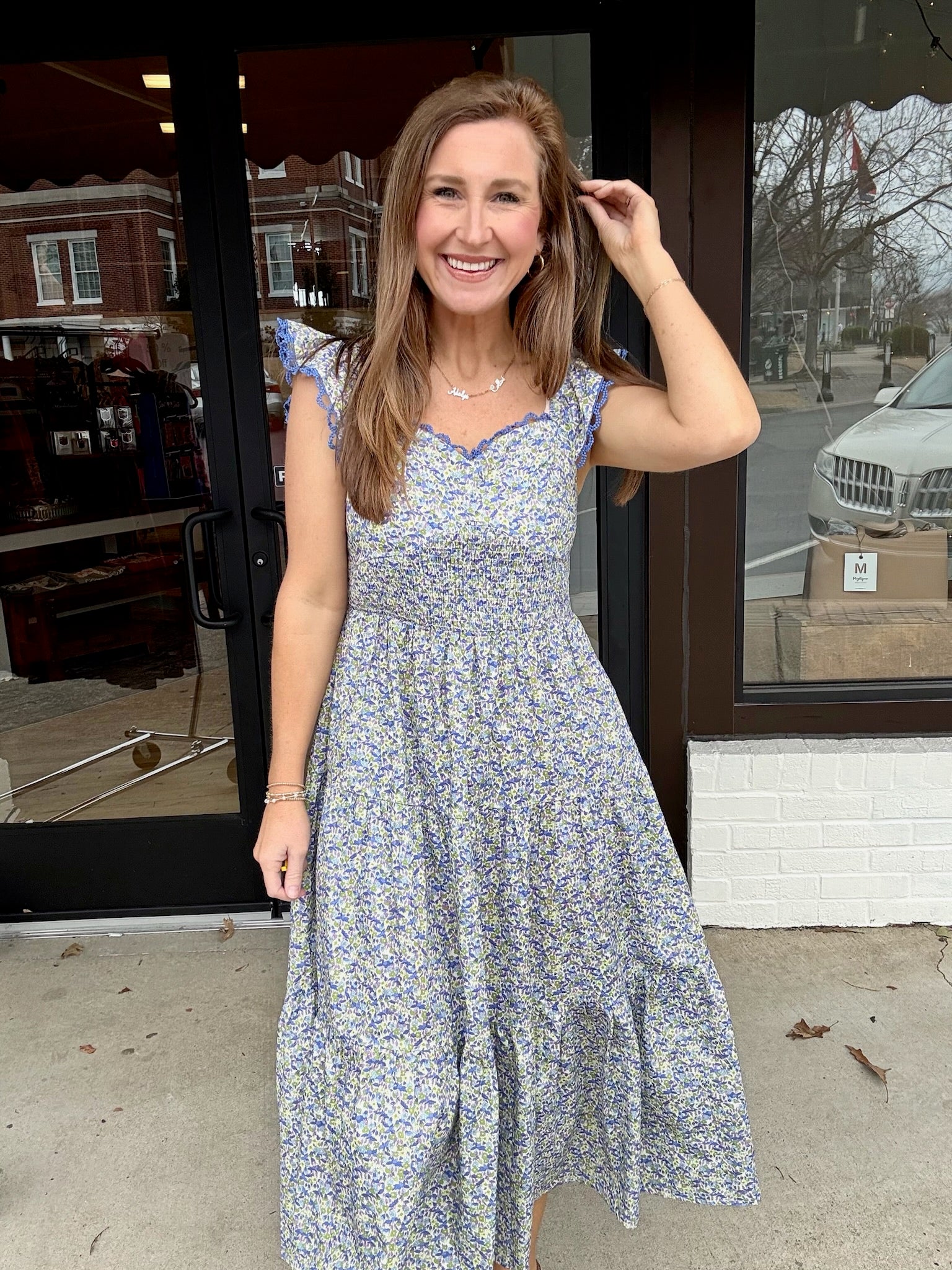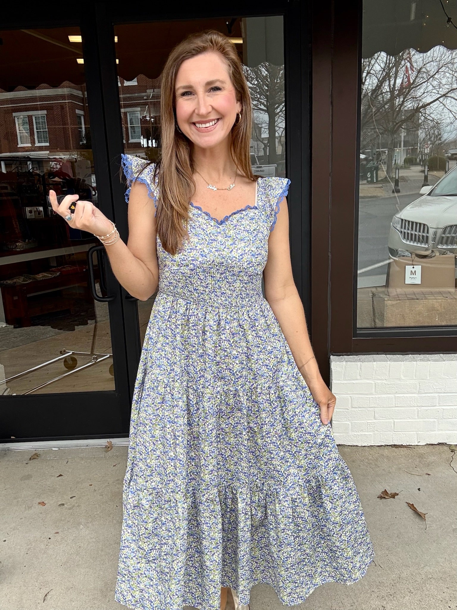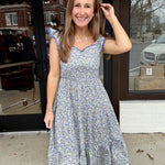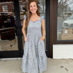 Light, feminine, and made for sunshine-filled days, The Bluebell Breeze Maxi is pure effortless charm. Featuring a flattering smocked bodice, delicate lace-trimmed flutter sleeves, and a flowy tiered skirt, this dreamy blue floral dress moves beautifully with you. Perfect for brunch, baby showers, or a stroll downtown — just pair with sandals and simple gold jewelry for an easy, polished look.
