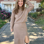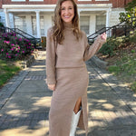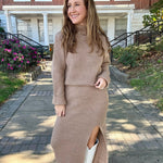 Effortless elegance meets cozy comfort in this chic two-piece ribbed sweater set. Featuring a relaxed mock neck top with subtle sleeve detail and a matching high-waisted midi skirt with a flirty side slit, this caramel-toned outfit is perfect for holiday photos, church, fall events, or a stylish day out. Wear together for a timeless, put-together look — or mix and match with your favorite denim or sweaters for endless versatility. Soft, stretchy, and flattering for every figure.