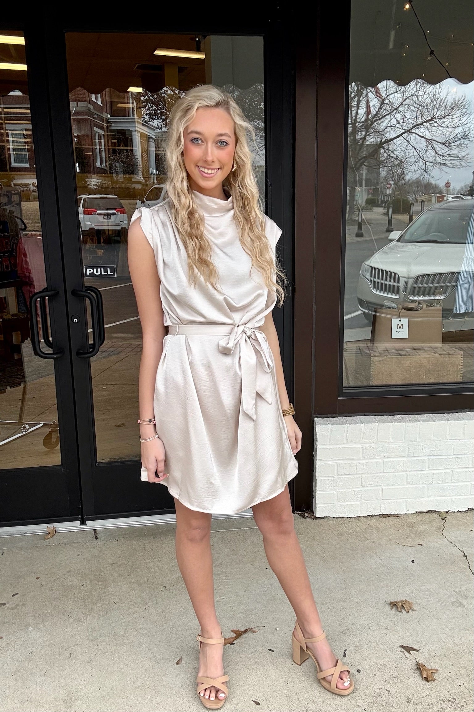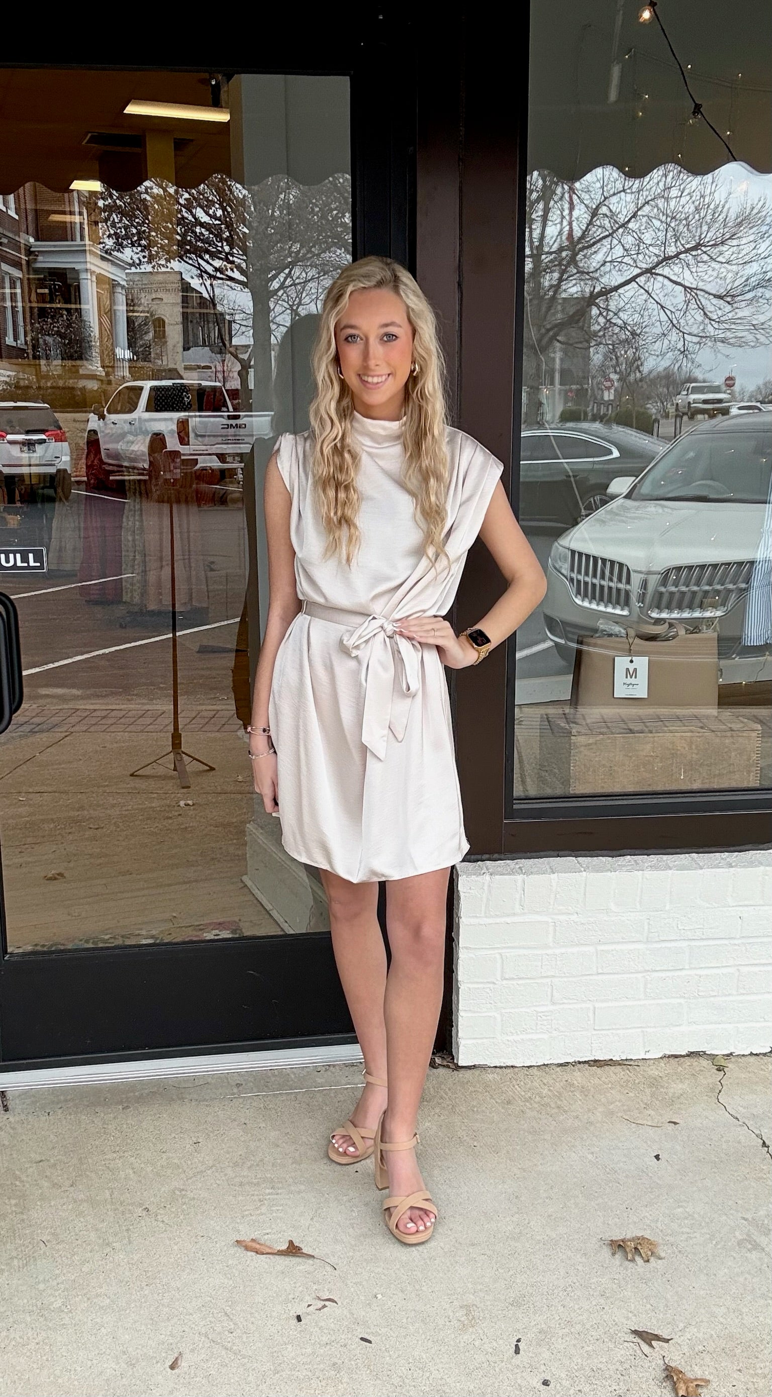 Elegant, polished, and effortlessly modern, The Champagne Chic Dress is a closet classic. Designed in a soft neutral hue with a sleek mock neckline and subtle cap sleeves, this beauty features a flattering self-tie waist that creates the perfect silhouette. The smooth, lightweight fabric drapes beautifully, making it ideal for date nights, bridal events, work functions, or any moment you want to feel confident and refined. Style it with heels for a dressy look or keep it simple with sandals for understated sophistication.