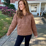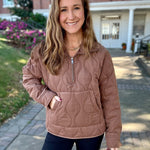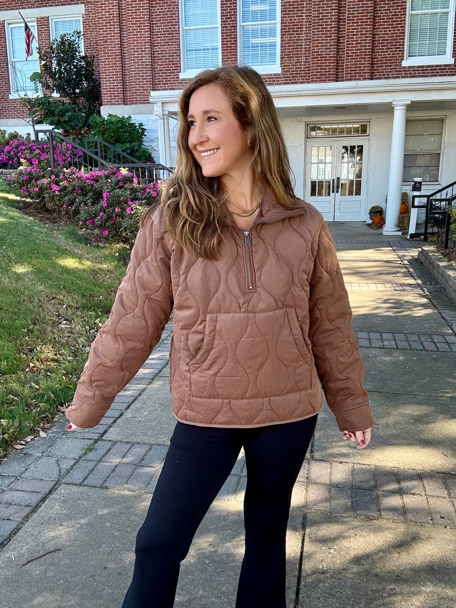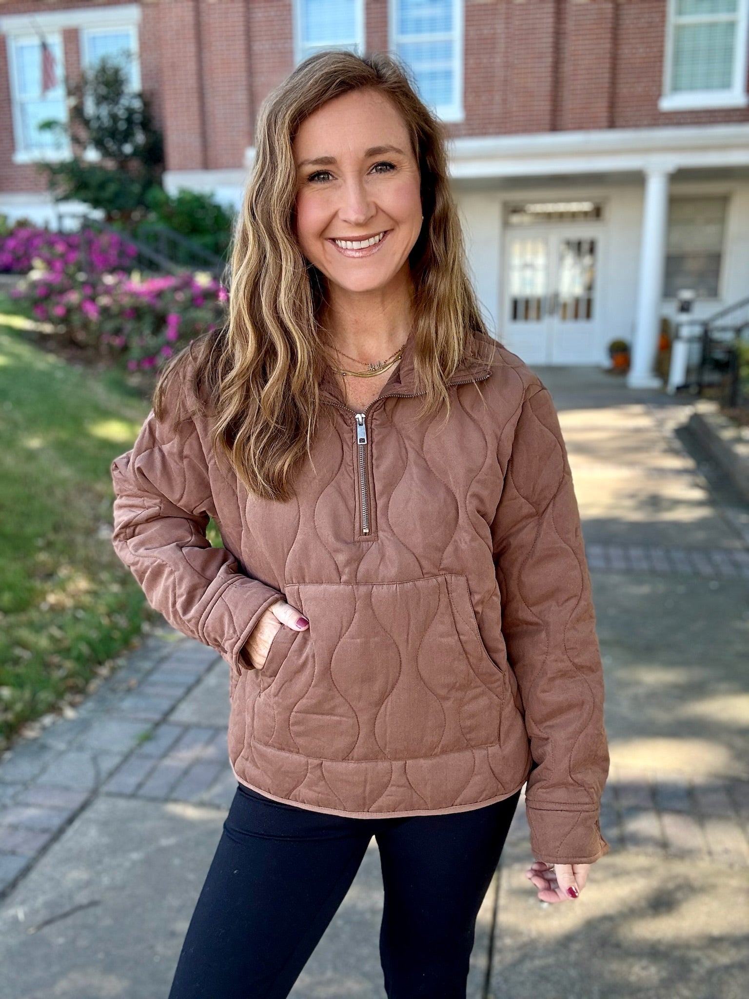 Stay warm and stylish in this ultra-soft quilted pullover — your new grab-and-go fall favorite. Featuring a cozy half-zip neckline, kangaroo pocket, and relaxed fit, this cocoa-toned layer is perfect for casual days, school drop-offs, bonfires, or running errands in style. Lightweight yet warm, it pairs effortlessly with leggings, jeans, or joggers for that cute-but-comfy everyday look. A must-have neutral you’ll wear on repeat.