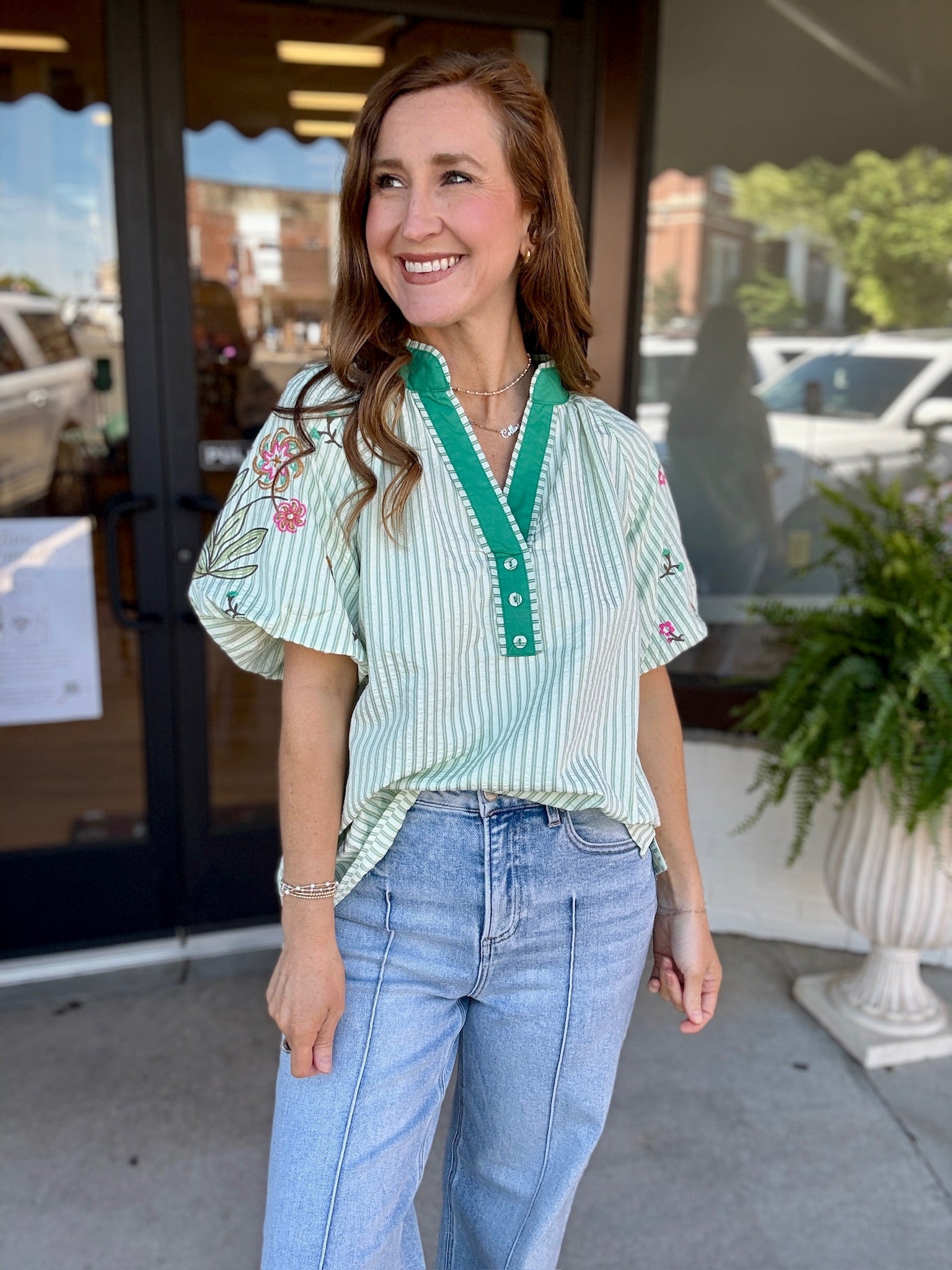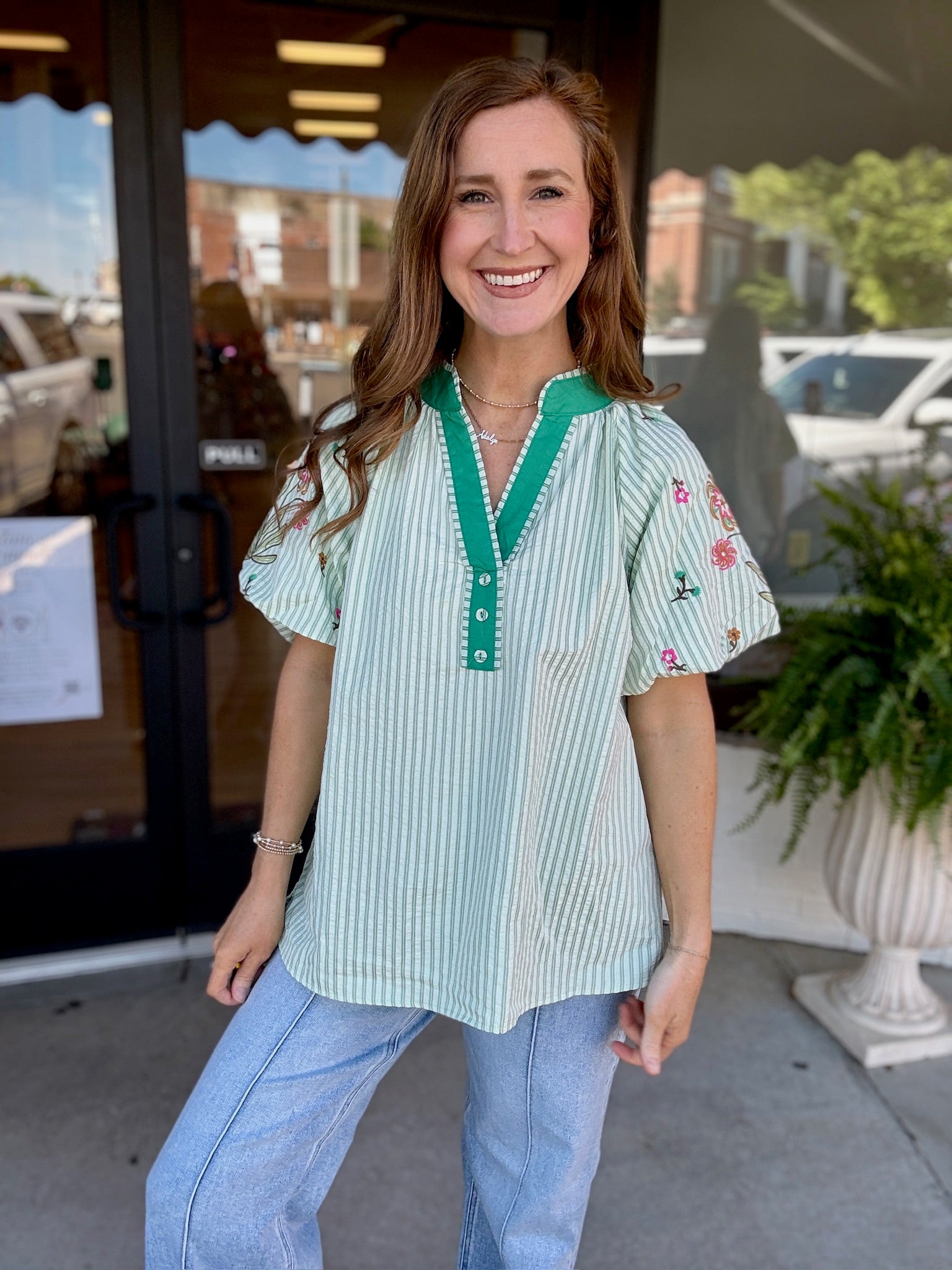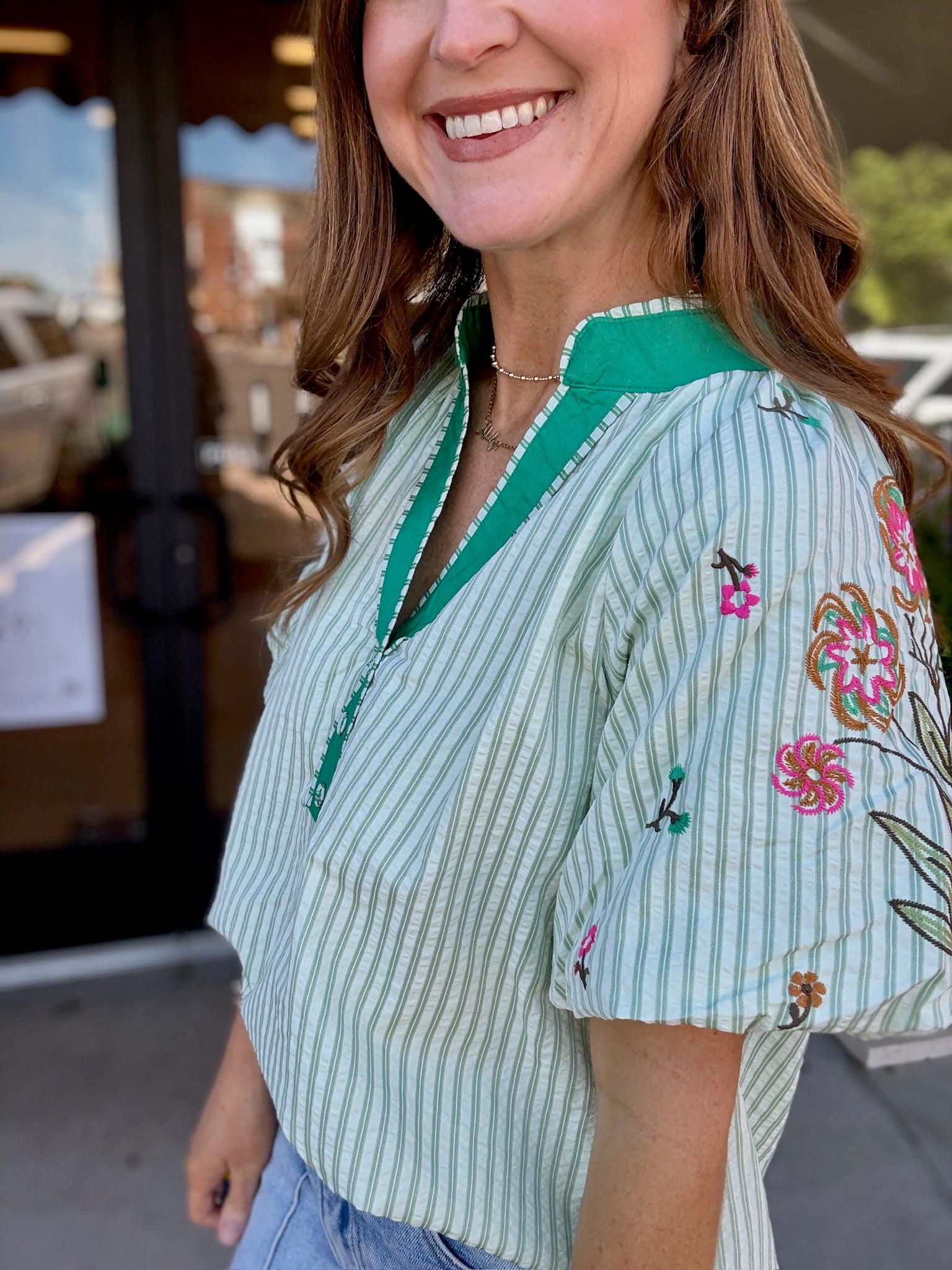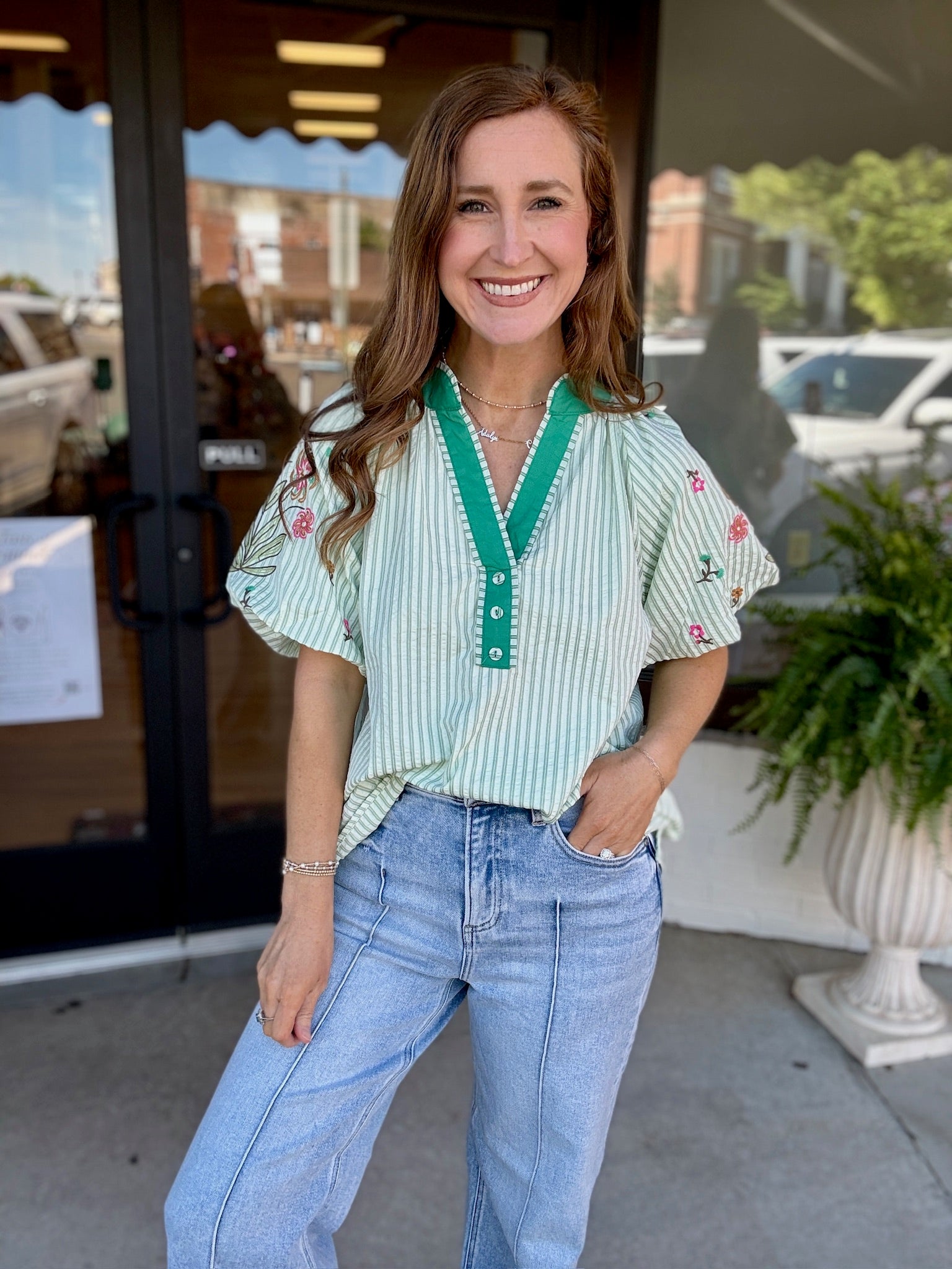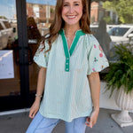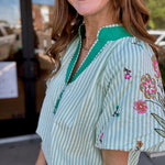 The perfect mix of classic + playful 💚 This striped beauty features the sweetest embroidered floral details and a bold contrast neckline that gives it that extra pop we love ✨