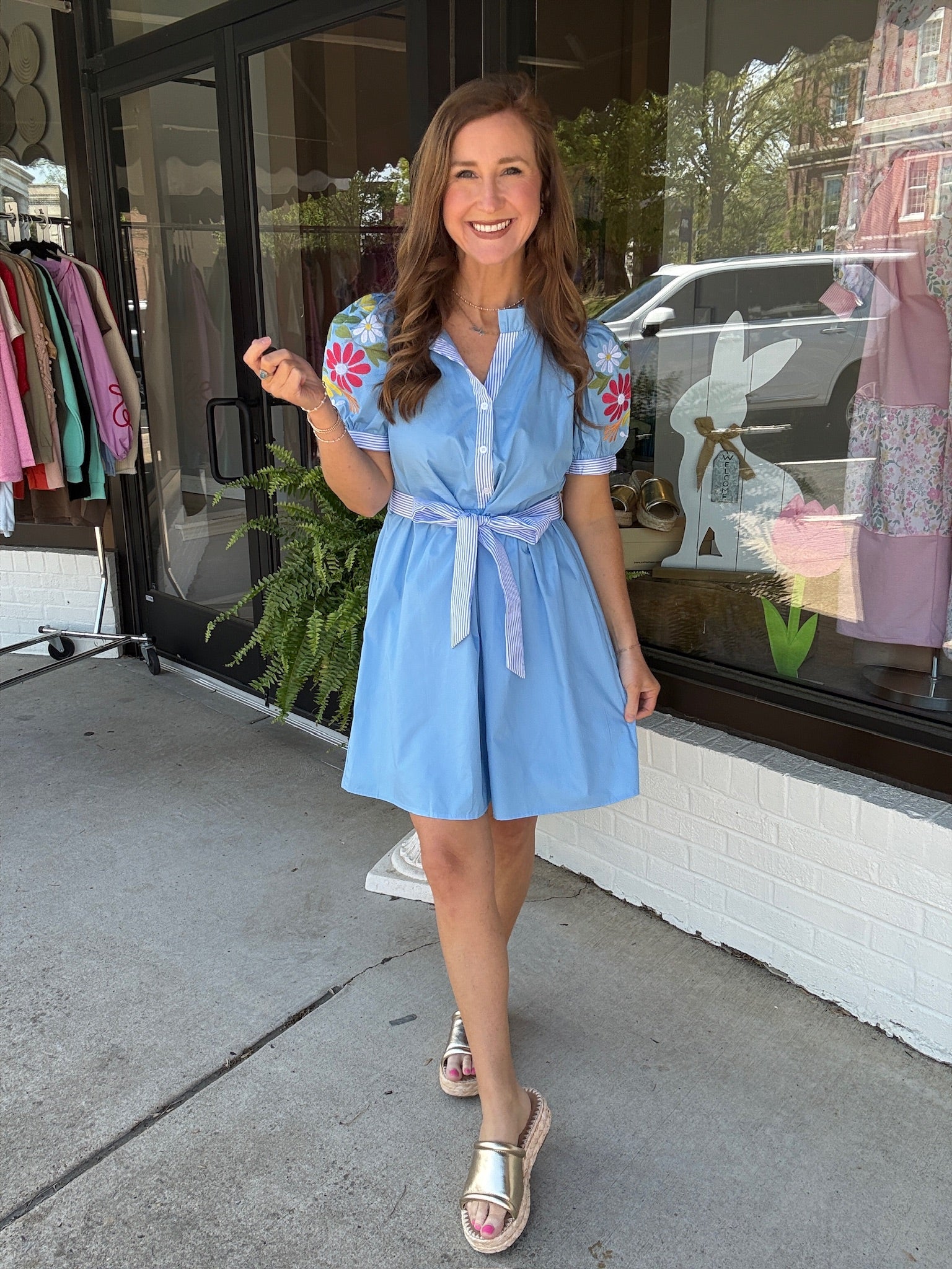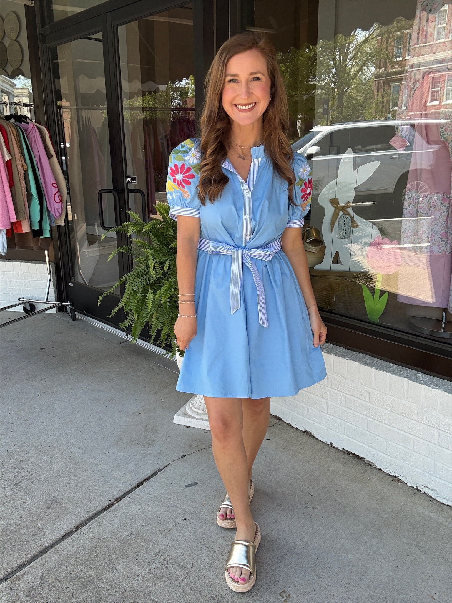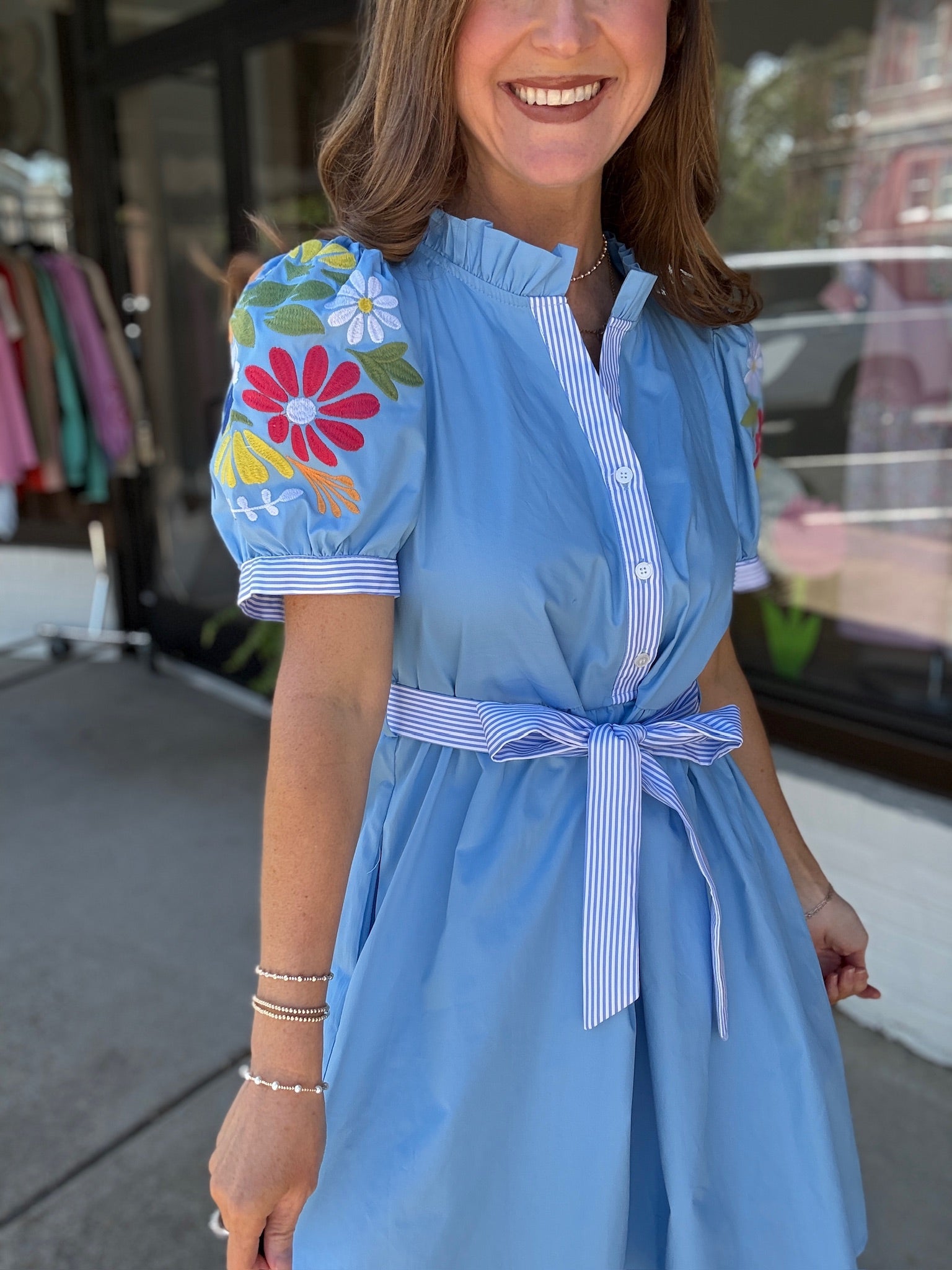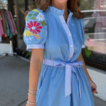 This one is truly a standout you didn’t know you needed 😍💙 The Hidden Gem Dress is full of the sweetest details—from the colorful floral embroidery on the sleeves to the flattering tie waist that pulls it all together perfectly ✨