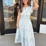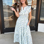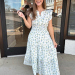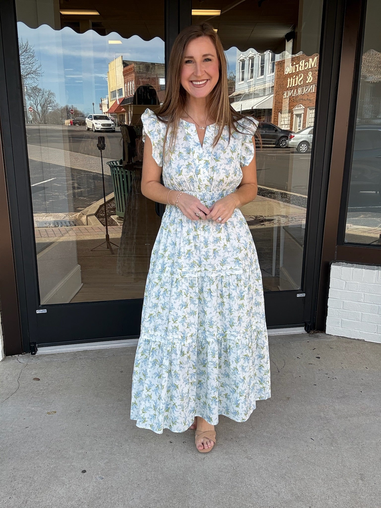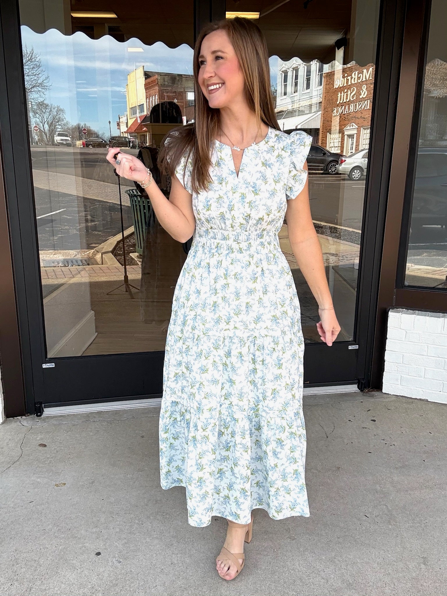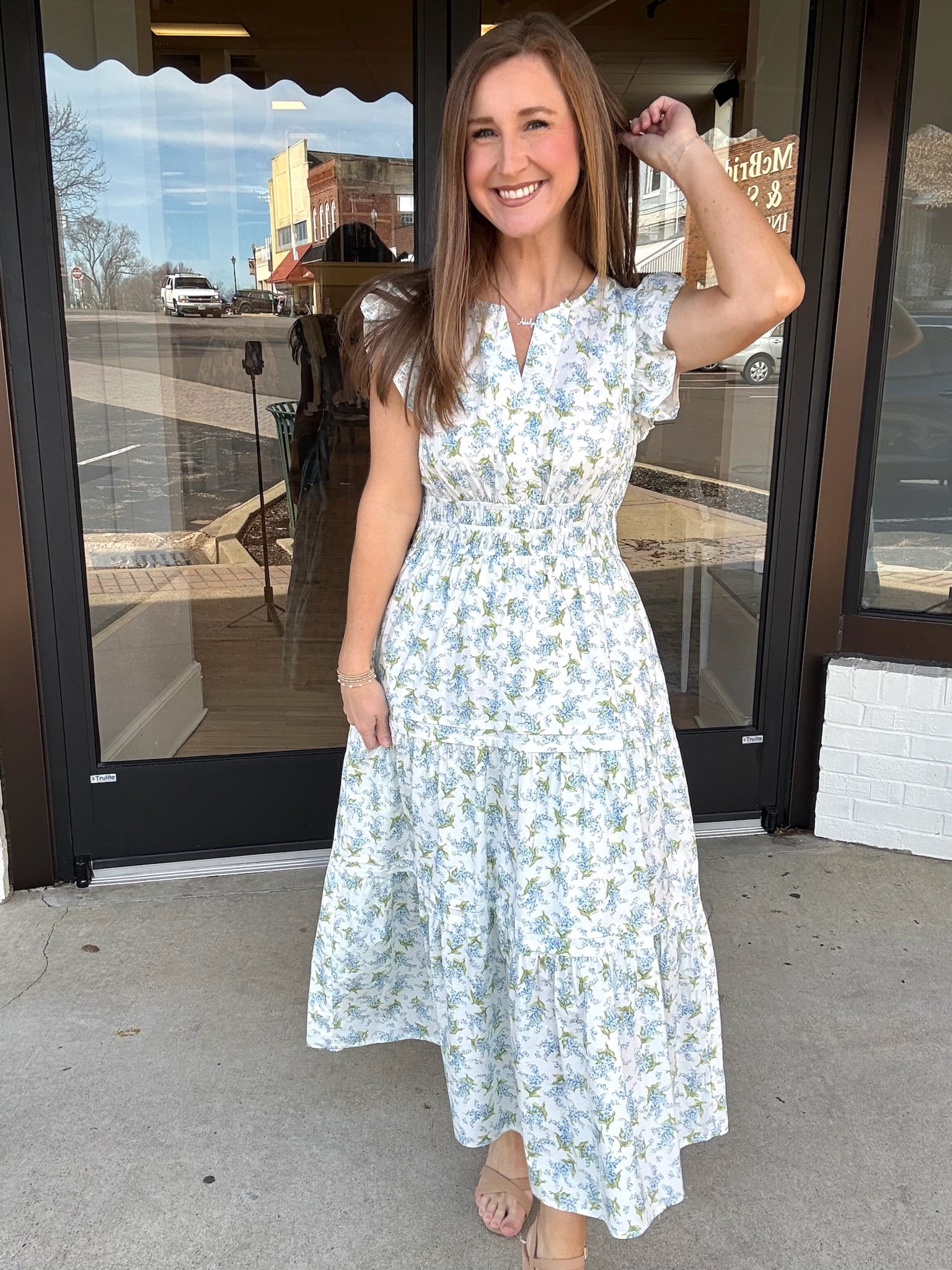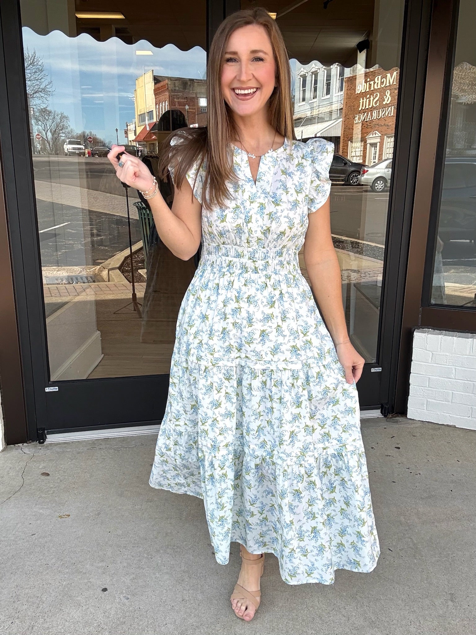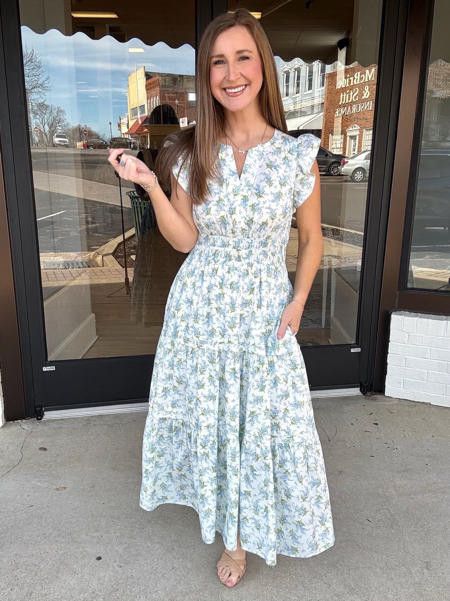 Soft, sweet, and effortlessly pretty — this floral midi features flutter sleeves, a flattering elastic waist, and a flowy tiered skirt made for sunny days and easy styling. Perfect for brunch, church, or spring outings! 🌸