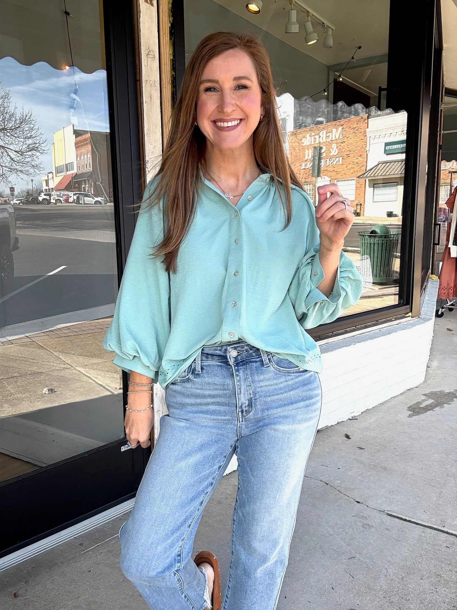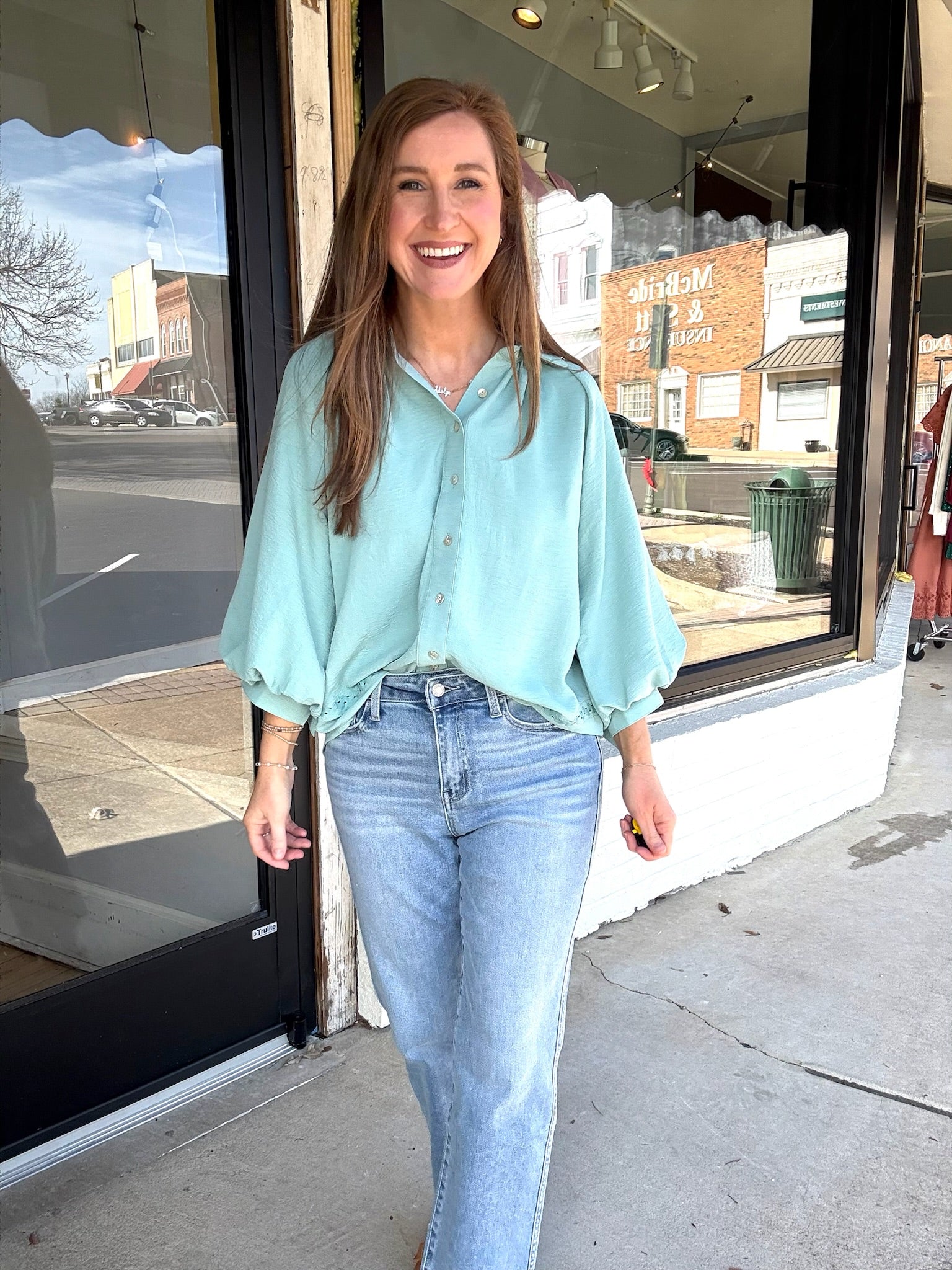 Fresh, flattering, and effortlessly chic — the Mint to Be Button-Down Blouse is your new everyday favorite. This breezy mint top features a soft textured fabric, relaxed dolman sleeves, and a flattering high-low hem that drapes beautifully whether worn tucked, half-tucked, or loose. The lightweight feel makes it perfect for year-round styling, from spring errands to casual office days.