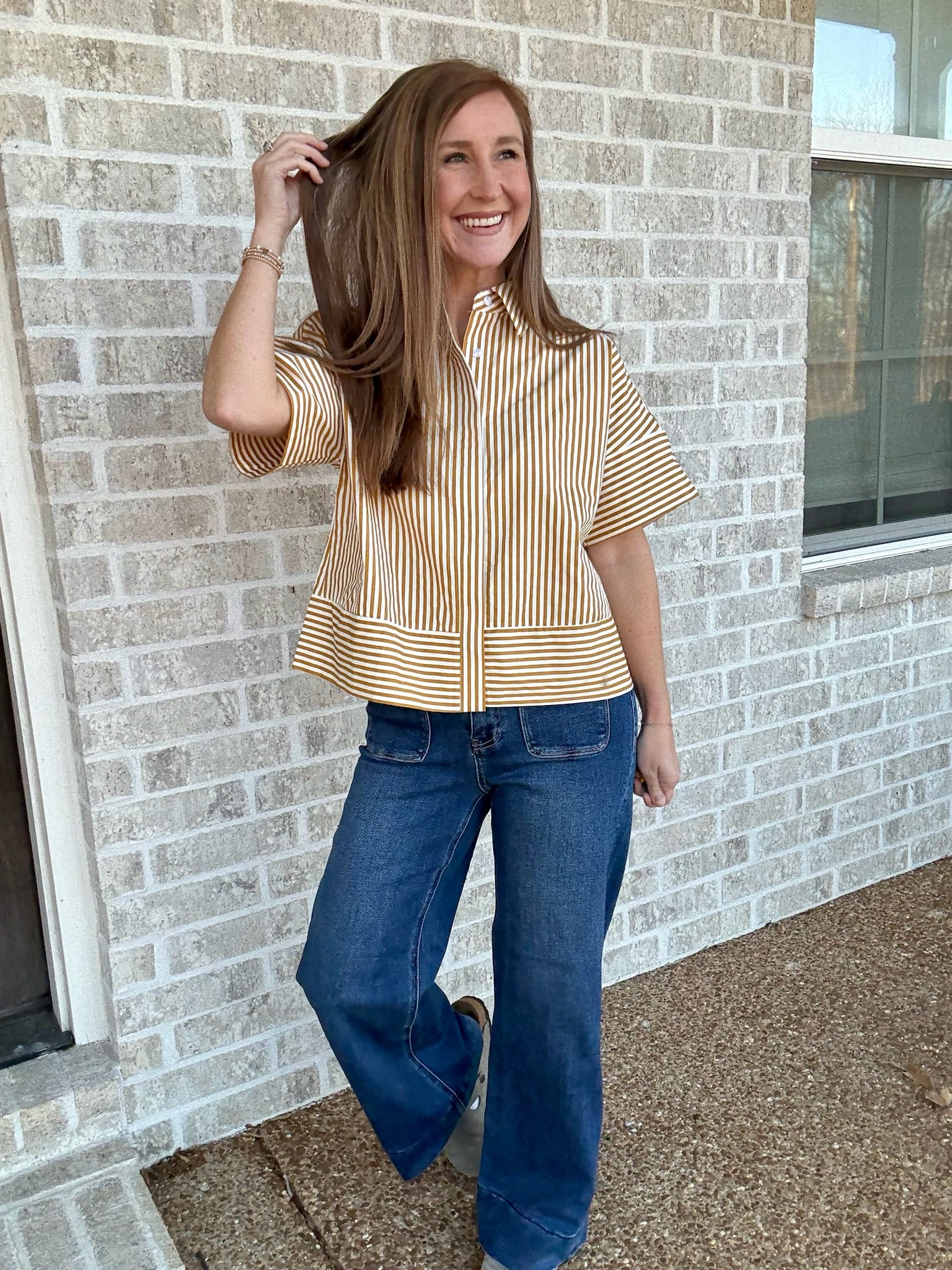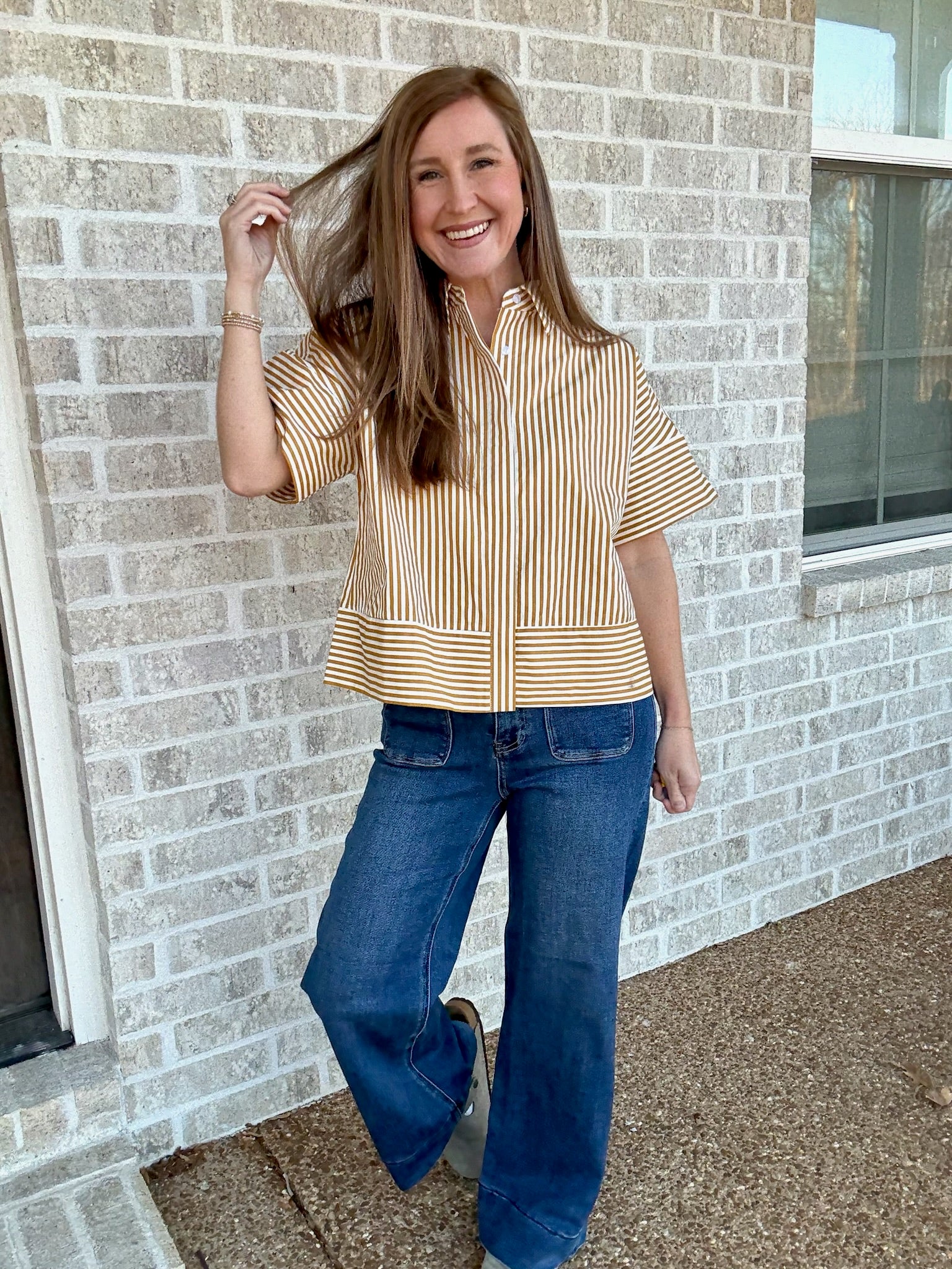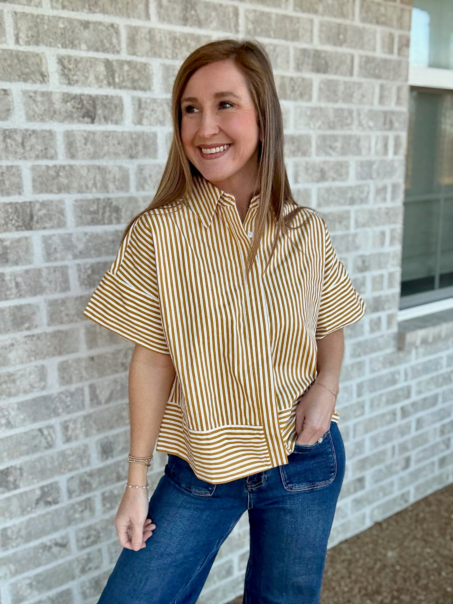 Neck Band Short Sleeve Button Down Top
