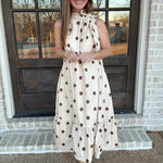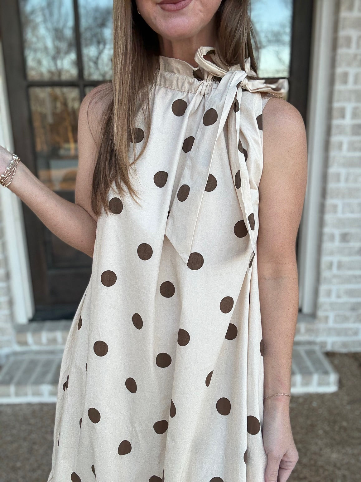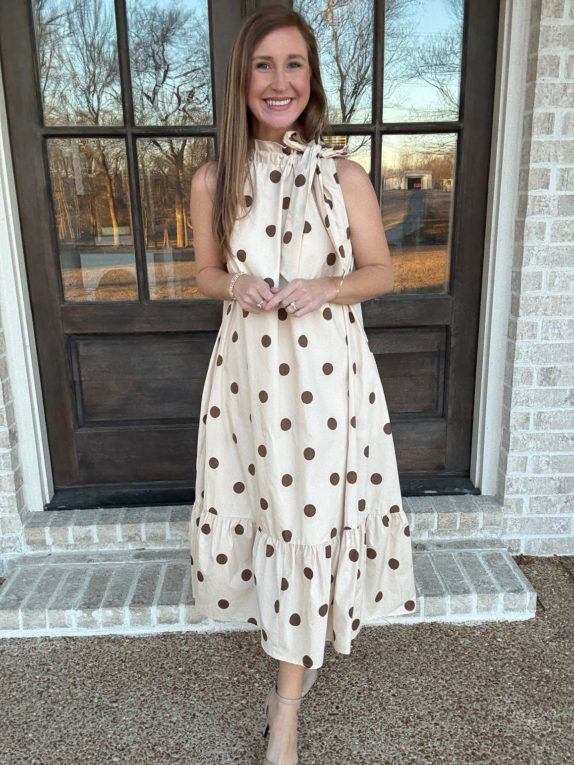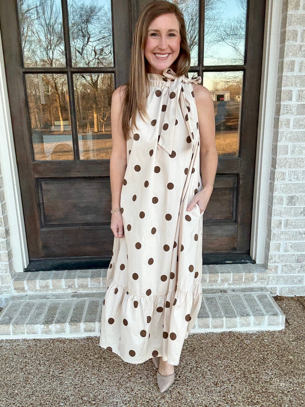 Pretty in a polka dot maxi dress featuring a chic neck tie detail. Flowy, flattering, and the perfect trendy piece for any occasion.