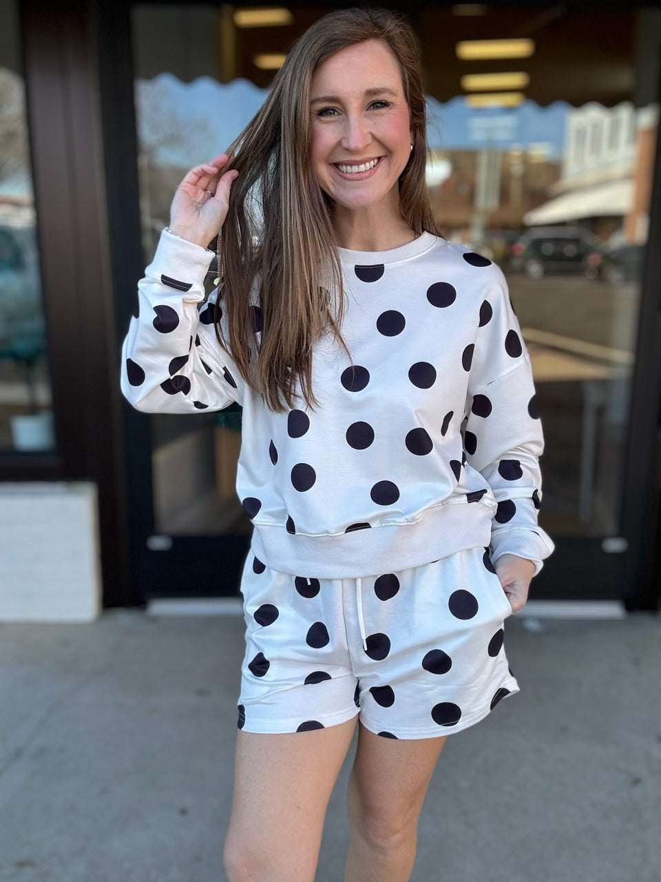 Polka dot cream and black 2-piece set, true to size with a comfy, flattering fit. Effortlessly trendy and perfect for everyday wear.