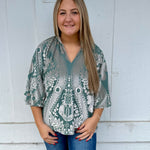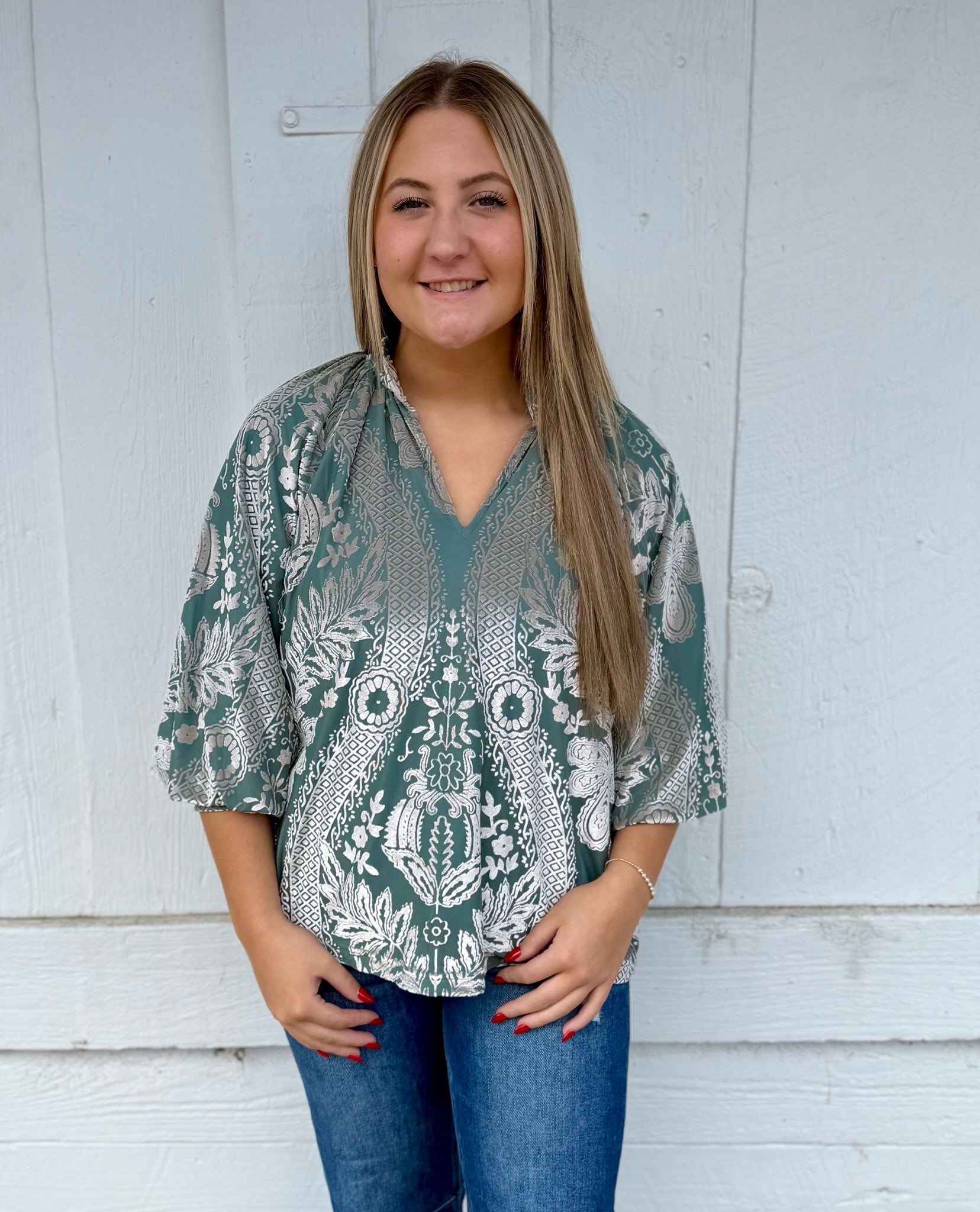 Classic meets contemporary in this stunning sage blouse adorned with an intricate baroque-inspired print. The relaxed silhouette, soft fabric, and subtle sheen create a graceful drape that flatters every figure. Perfectly versatile, it’s an effortless choice for both workdays and weekends — just pair with denim or trousers for a refined, timeless look.