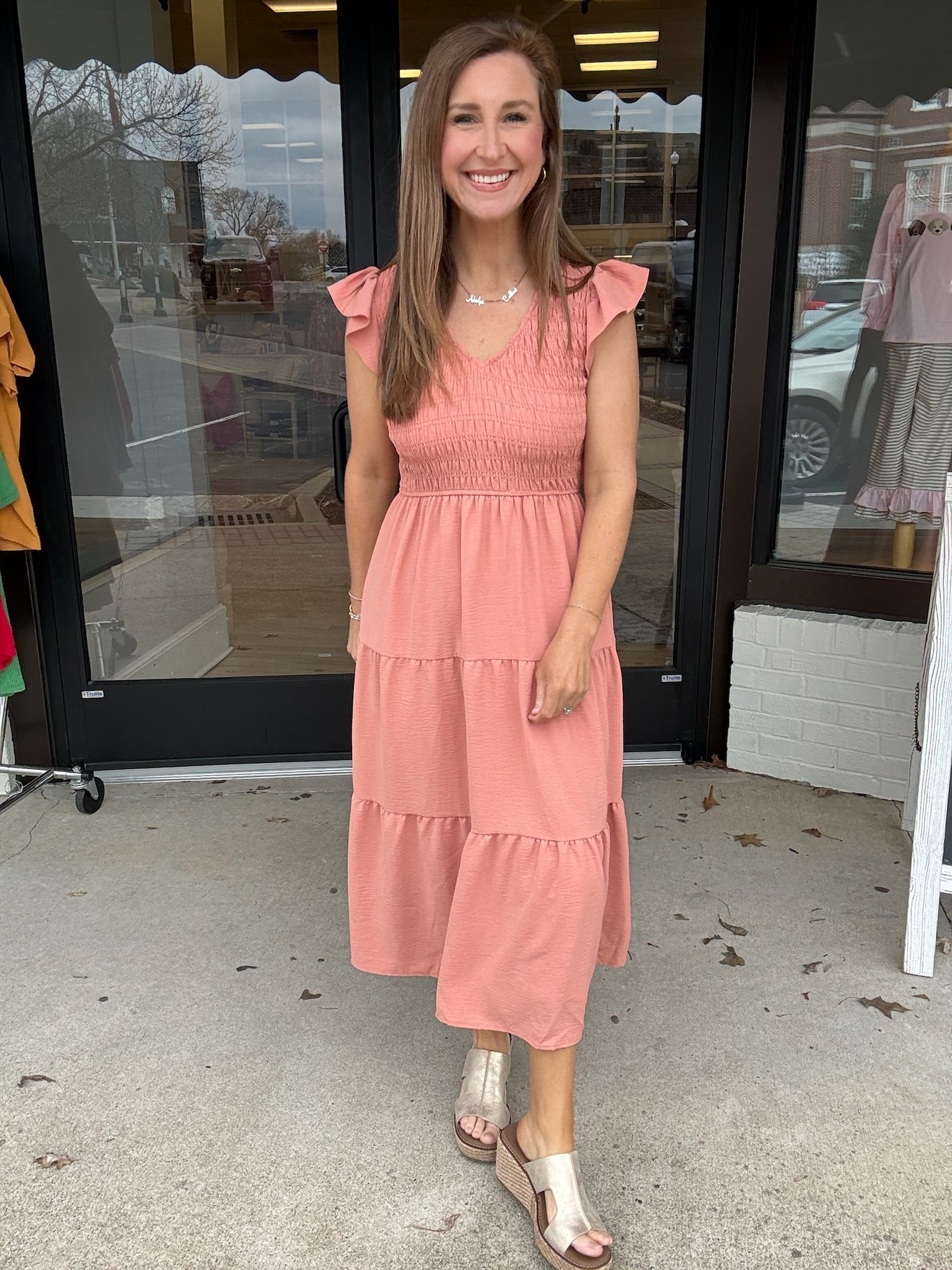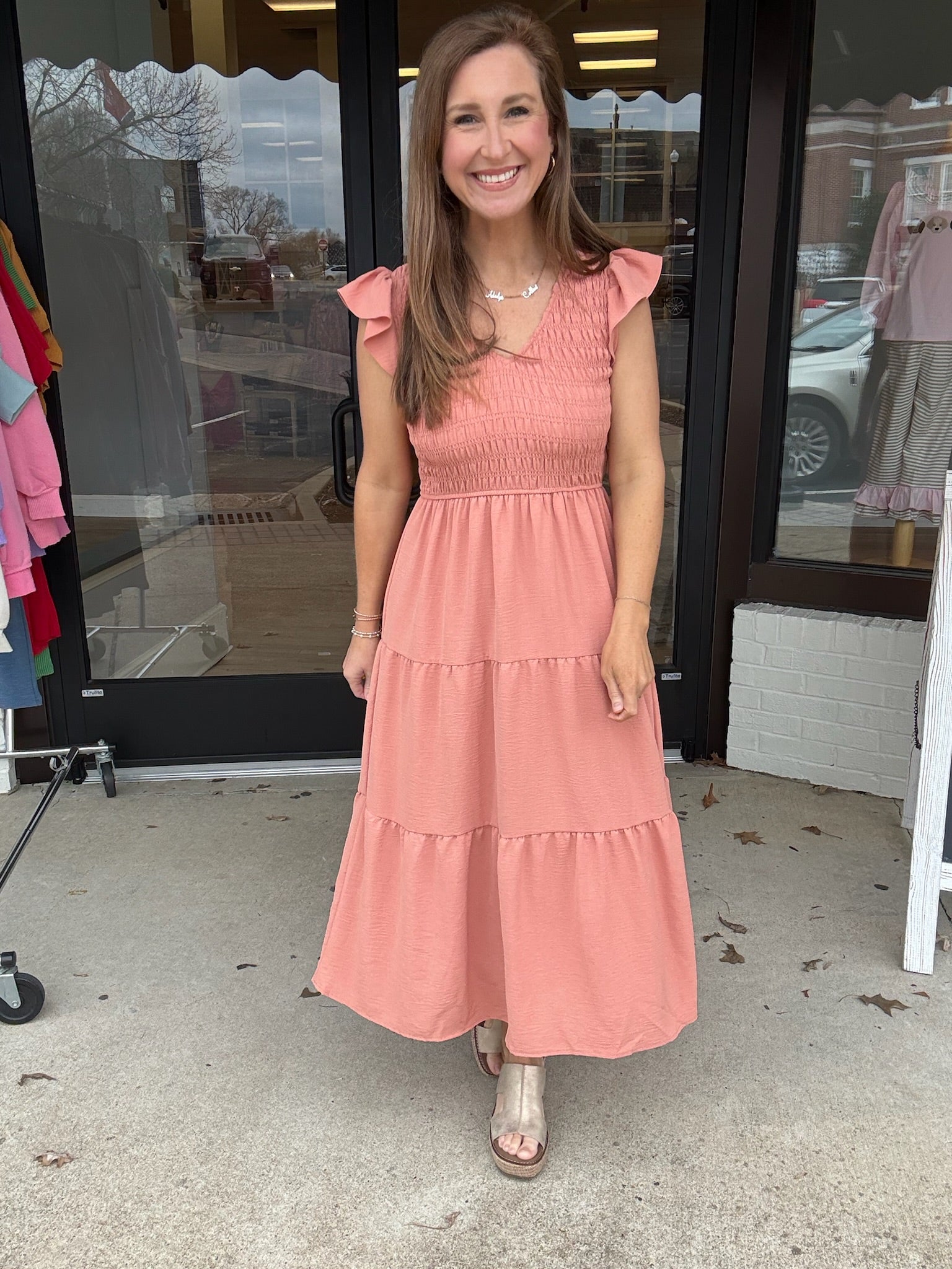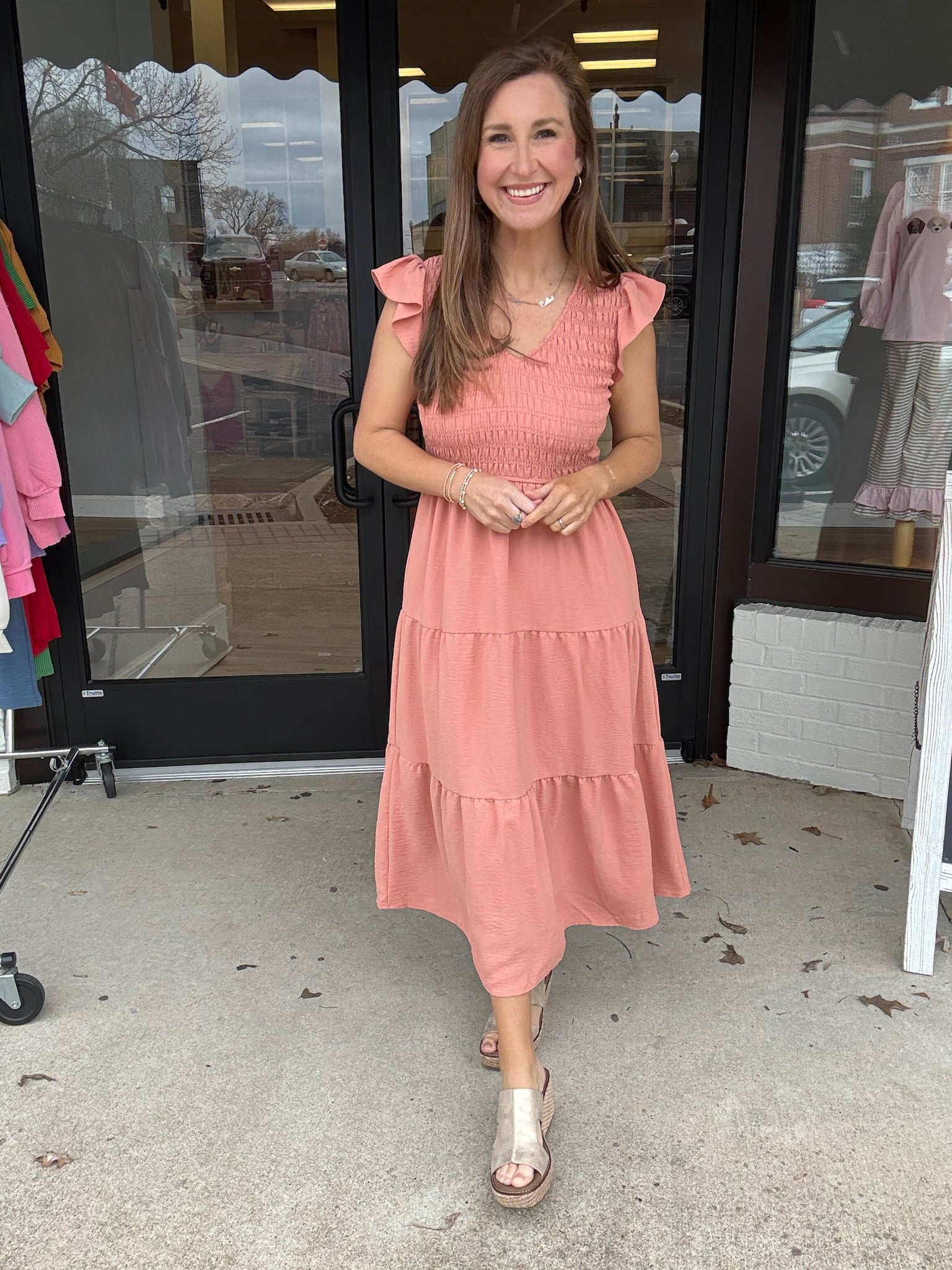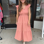 Soft, feminine, and made for everyday elegance, The Sunset Serenity Midi is your go-to for effortless style. Featuring a flattering smocked bodice, delicate ruffle sleeves, and a flowy tiered skirt, this dreamy dusty-rose dress offers comfort without sacrificing charm. The lightweight fabric and easy silhouette make it perfect for brunch dates, church, vacations, or simply feeling pretty on the go. Pair with wedges or sandals for a look that’s polished yet relaxed.