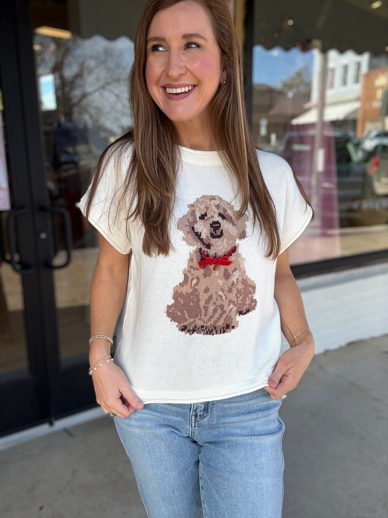 Add the cutest touch to your everyday style with our Sweet Pup Knit Sweater Tee! This lightweight knit top features an adorable puppy design finished with a charming red bow, making it the perfect blend of cozy and playful. The soft, breathable fabric and relaxed silhouette make it easy to dress up with jeans or keep casual with leggings for errands, school drop-offs, or weekend coffee runs.