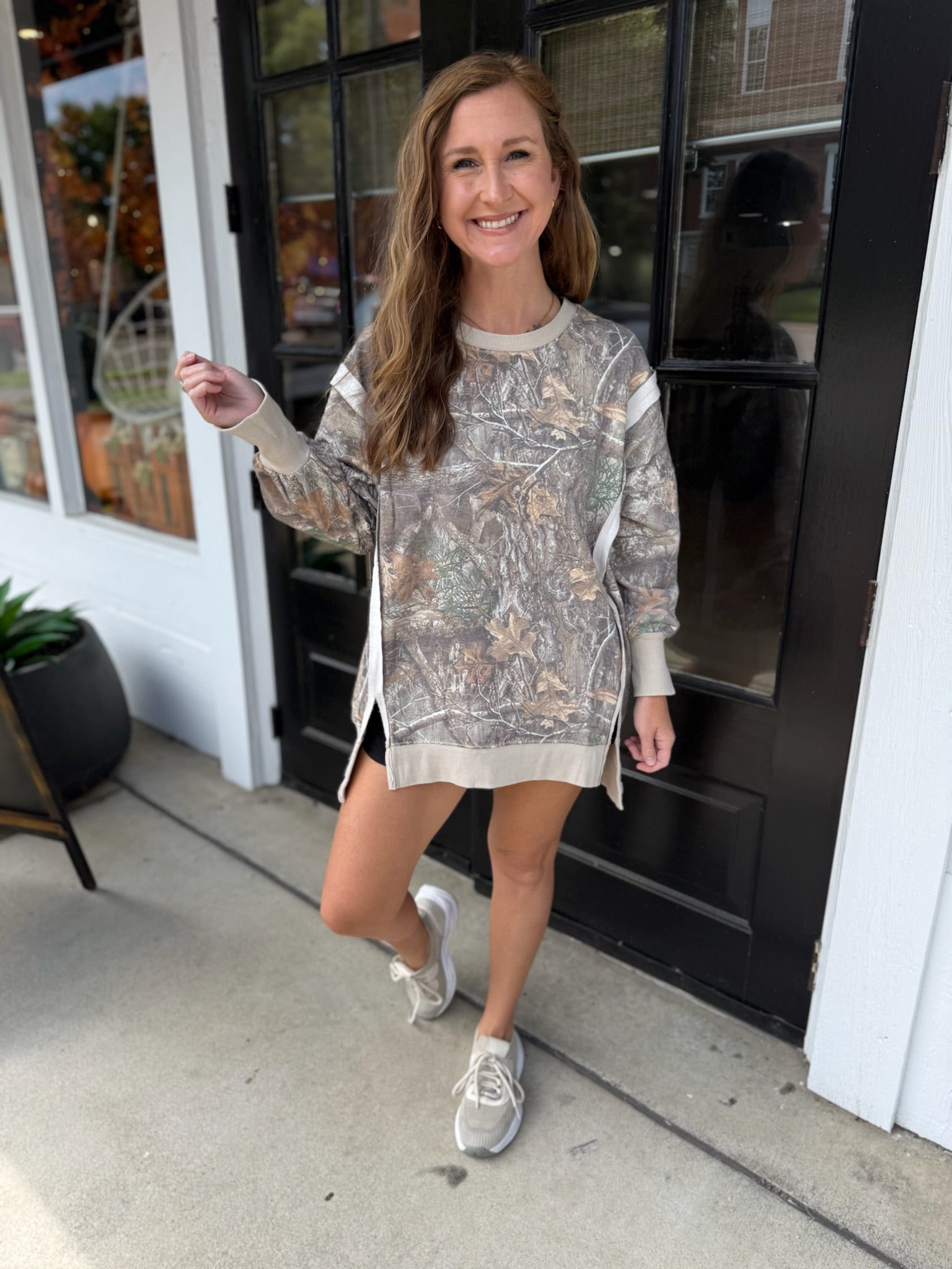 Effortlessly comfy with a laid-back edge — this longline camo sweatshirt is perfect for fall Saturdays, football season, or casual errands. Featuring an oversized relaxed fit with side slits for easy movement, it has a subtle beige trim that adds a clean, modern touch to the classic camo look. Pair with sneakers or leggings for a cute, sporty, and effortless outfit you’ll reach for again and again.